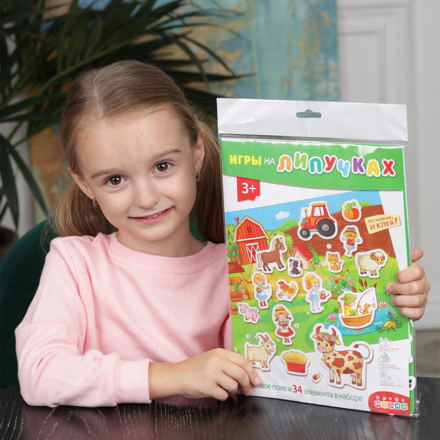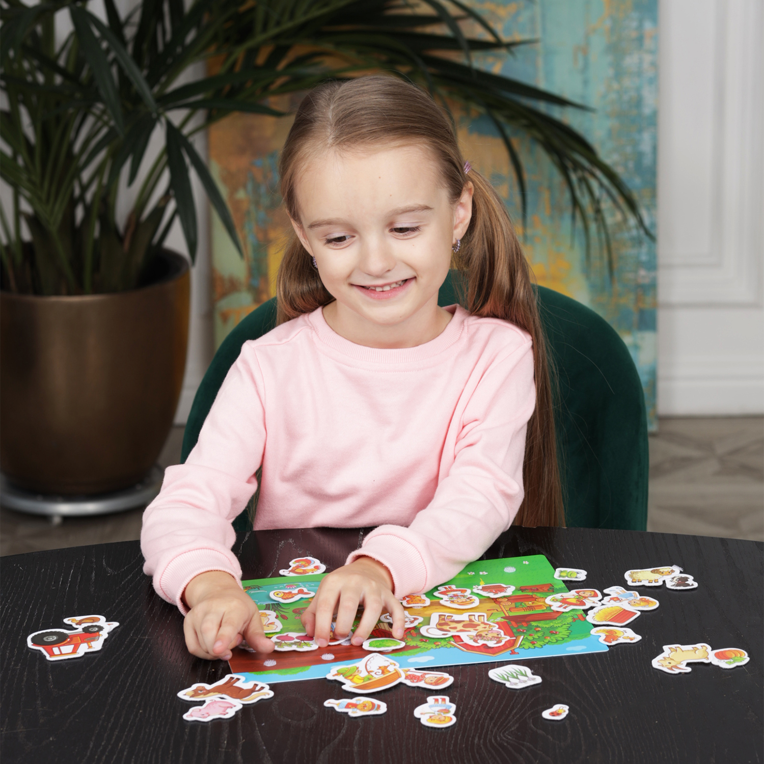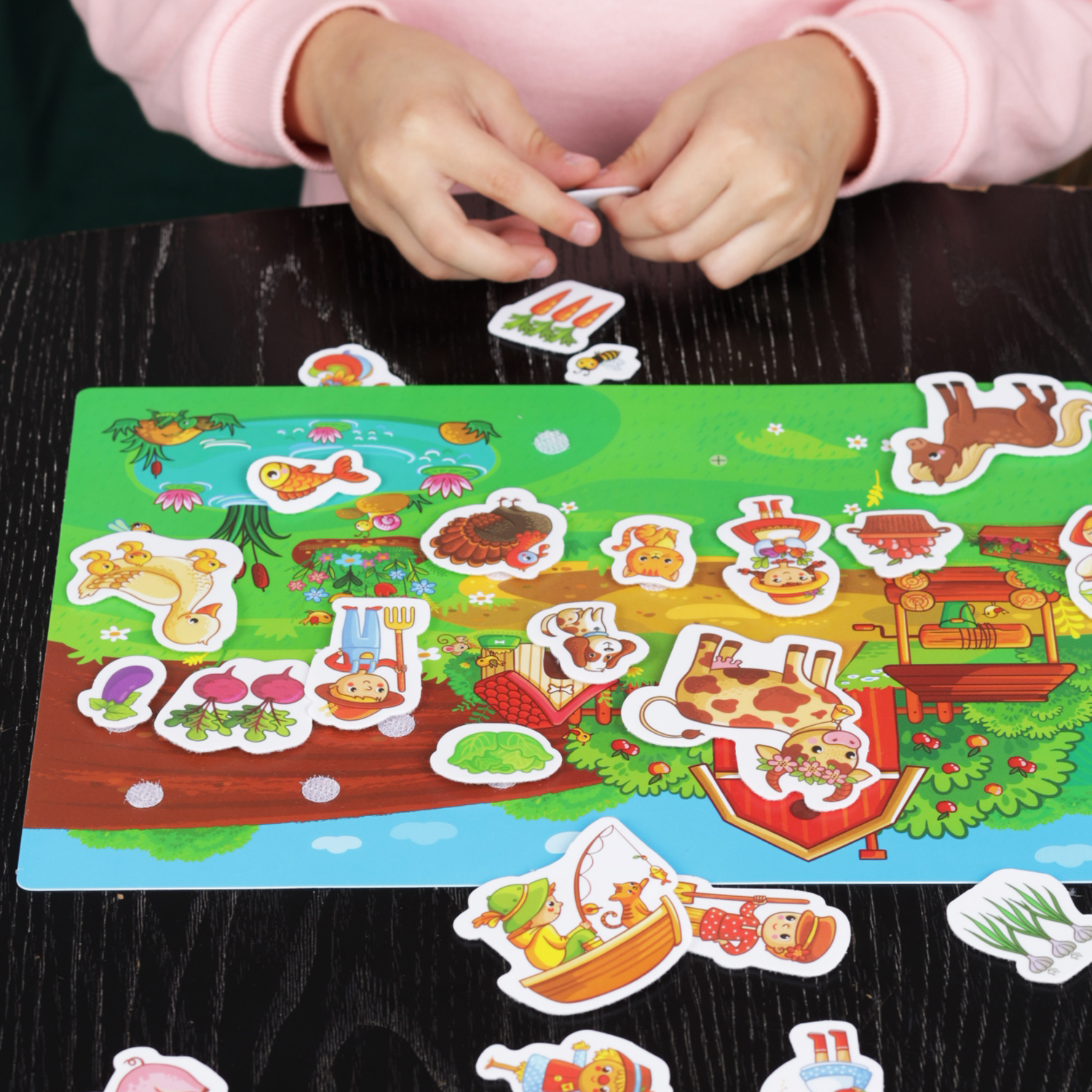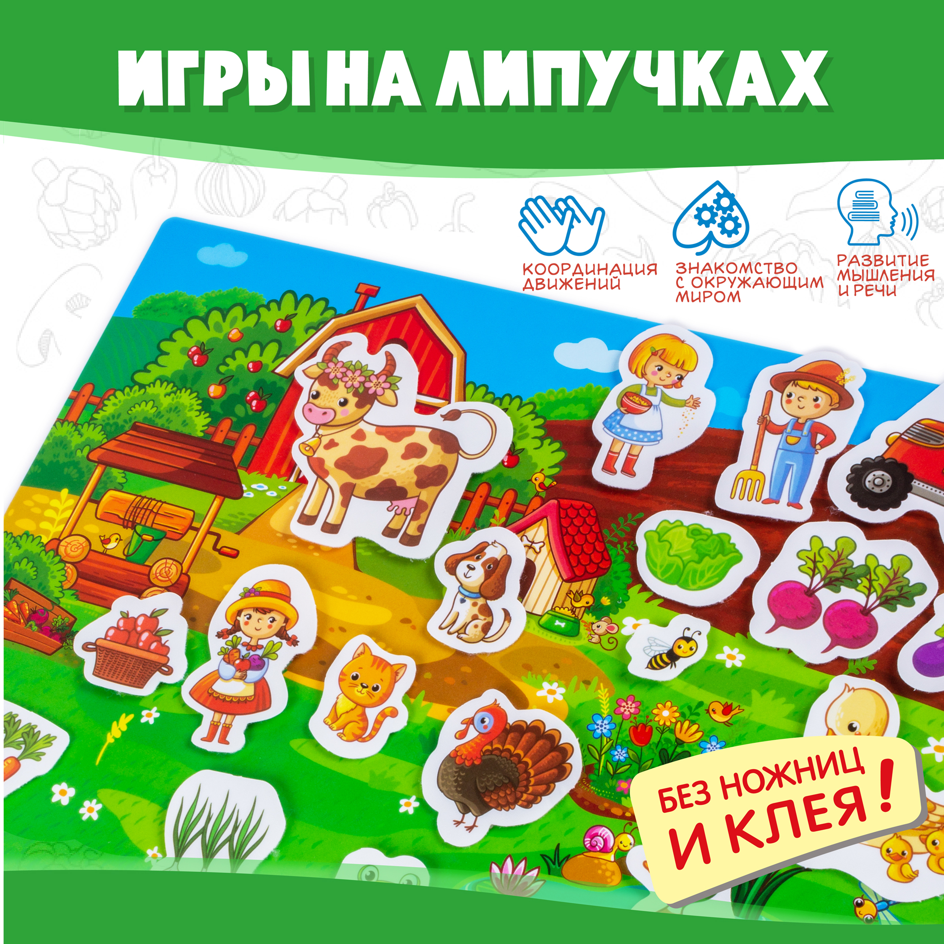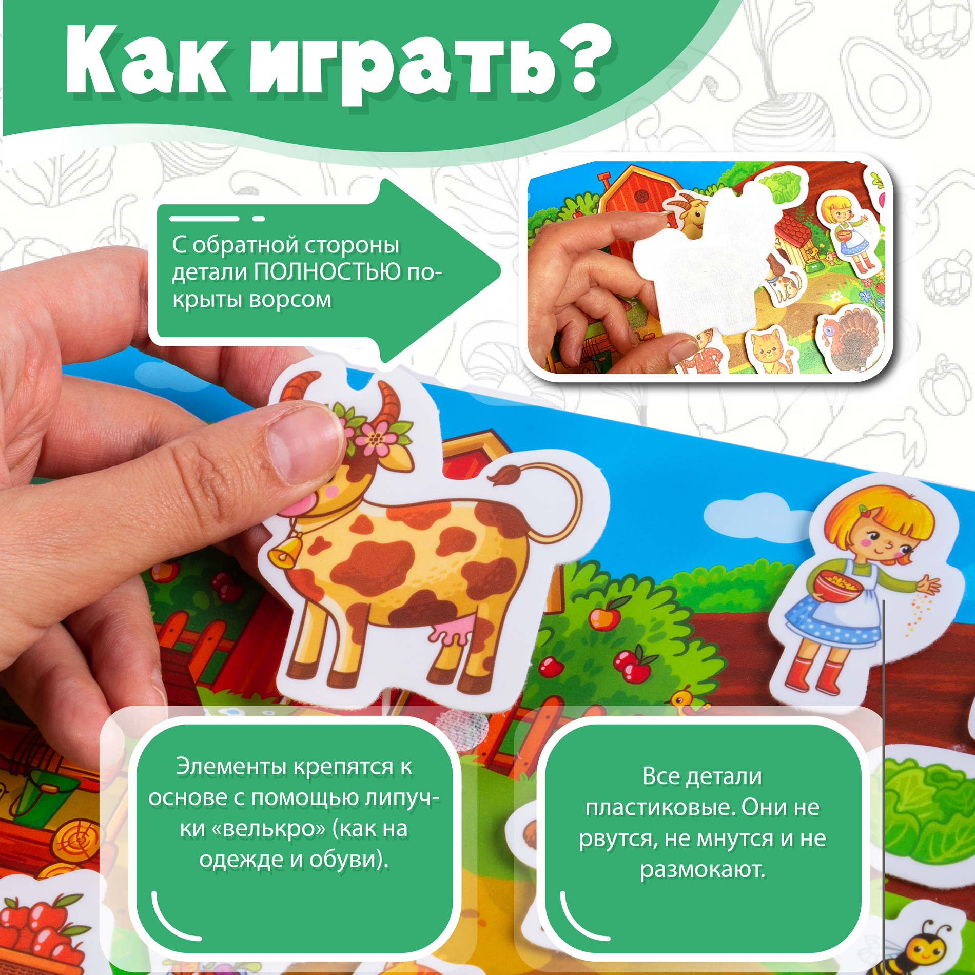 Игра знакомит с домашними животными и их детёнышами, растениями, которые можно вырастить на огороде, деятельностью человека на ферме. Учит придумывать истории, пользоваться липучками, развивает речь, мышление, мелкую моторику.