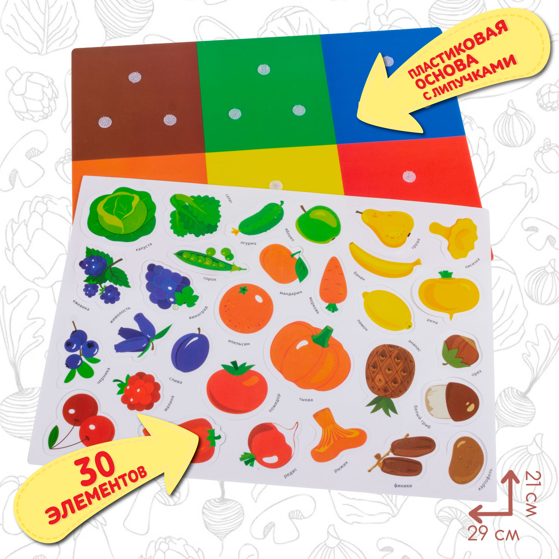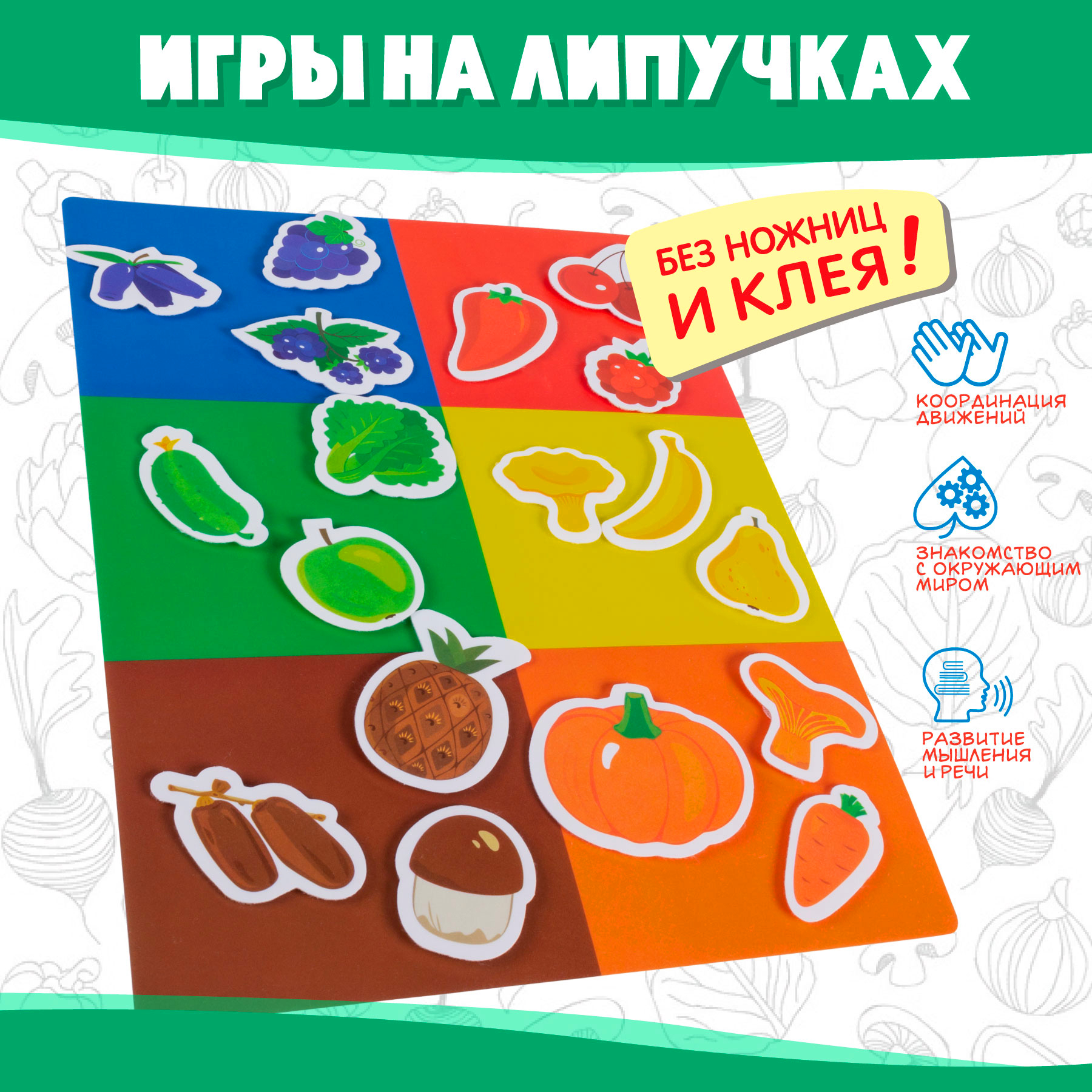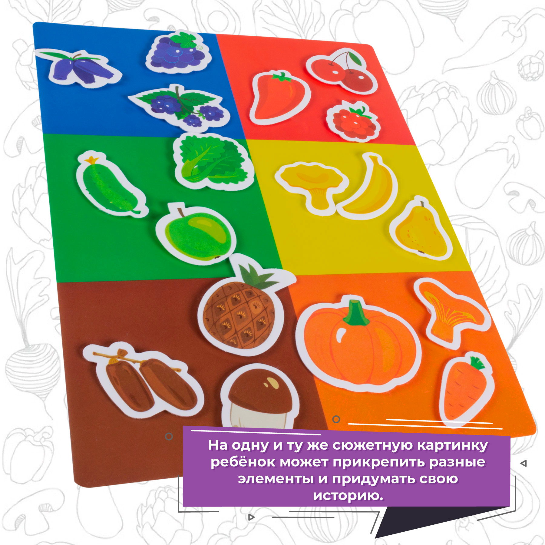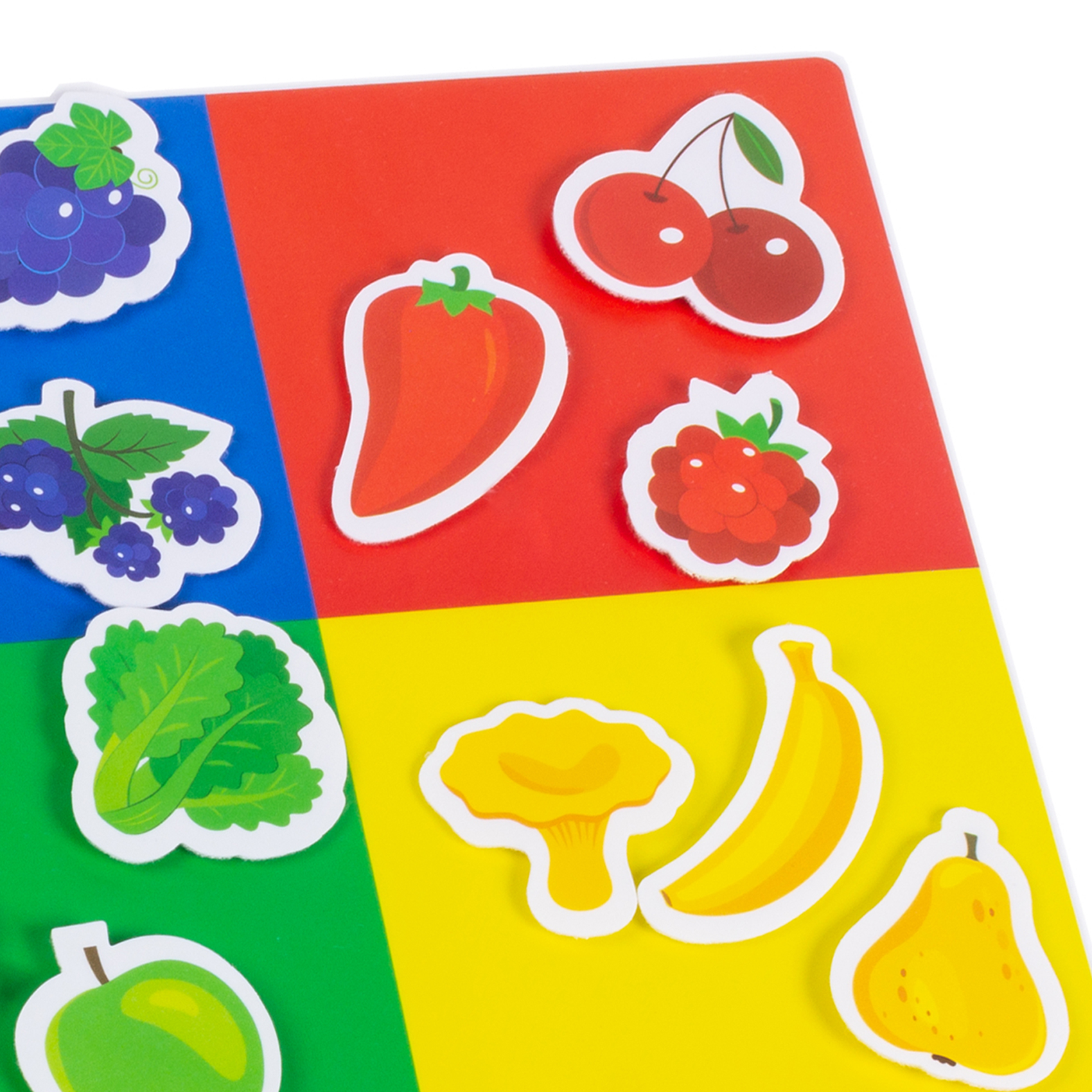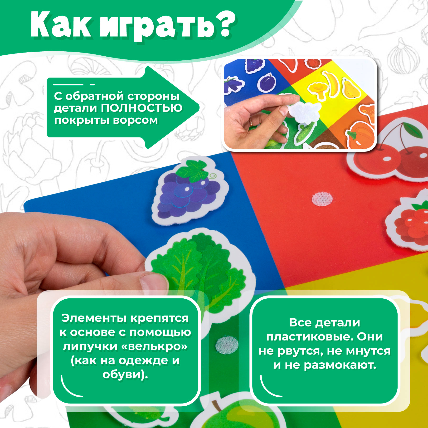 Овощи и фрукты крепятся к основе с помощью липучки «велькро» (как на одежде и обуви). Ребёнок может собрать по три продукта одного цвета (выбирая те, что ему больше нравятся), или сгруппировать иначе: отдельно овощи, фрукты, ягоды, грибы, продукты для супа, салата, компота, цитрусовые и т. п.