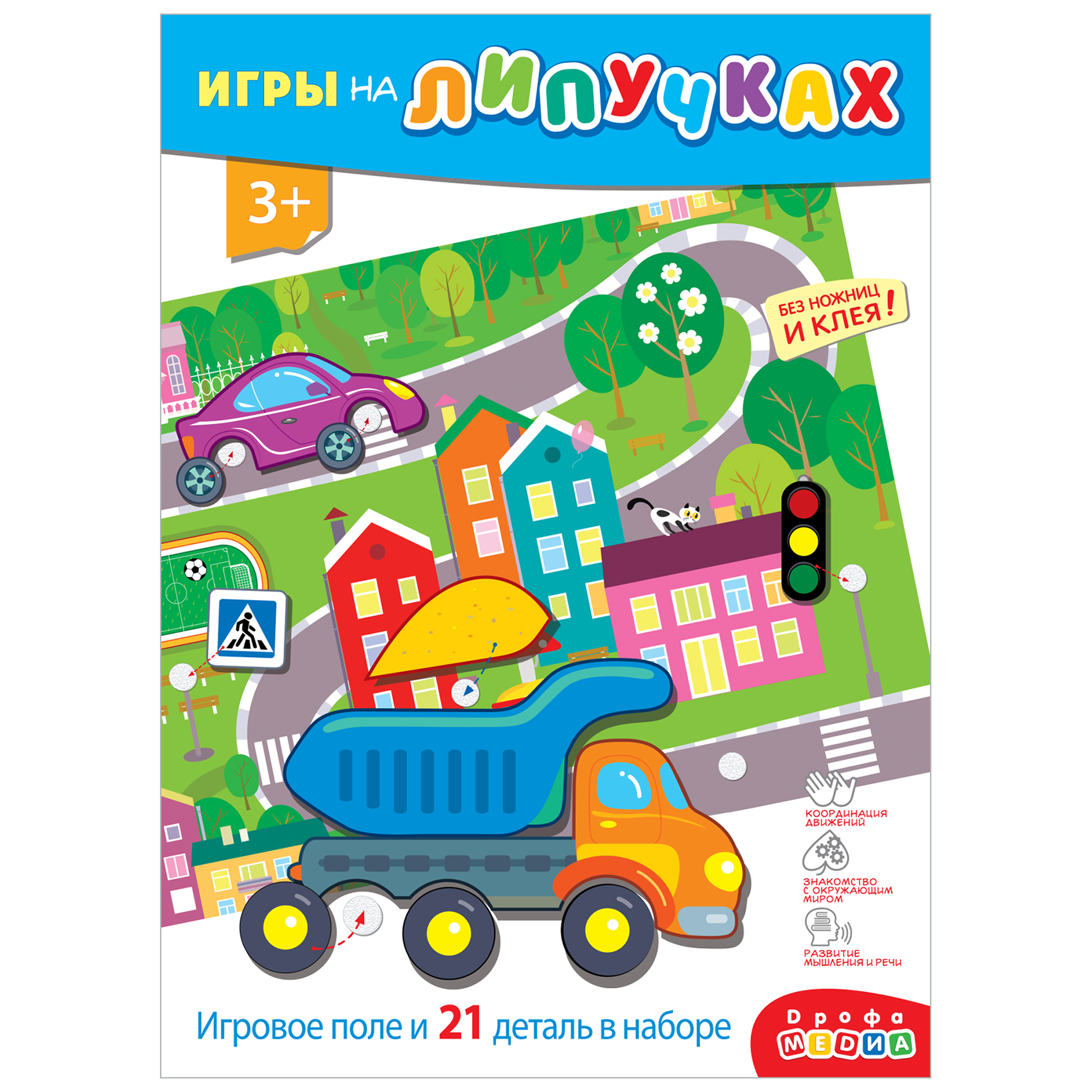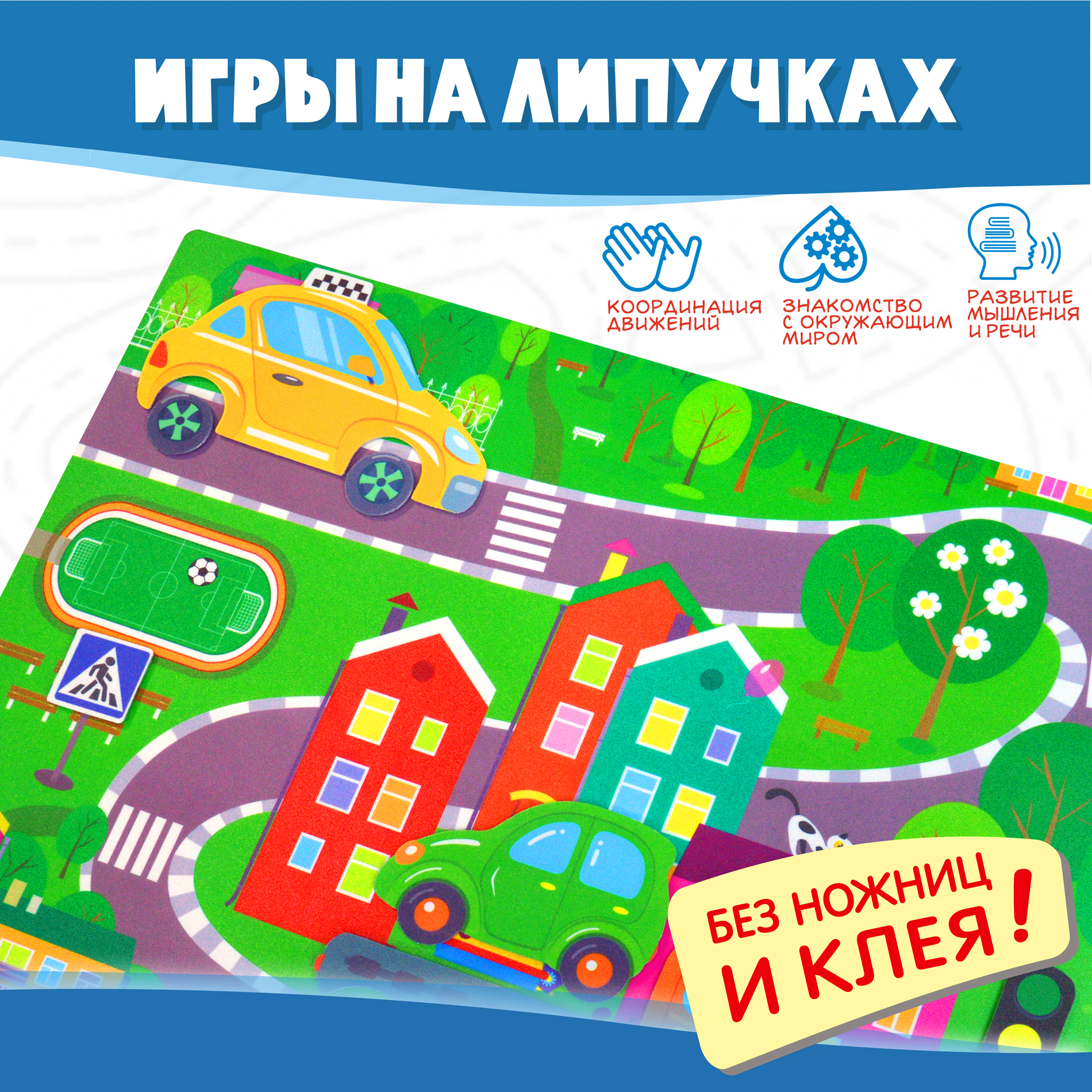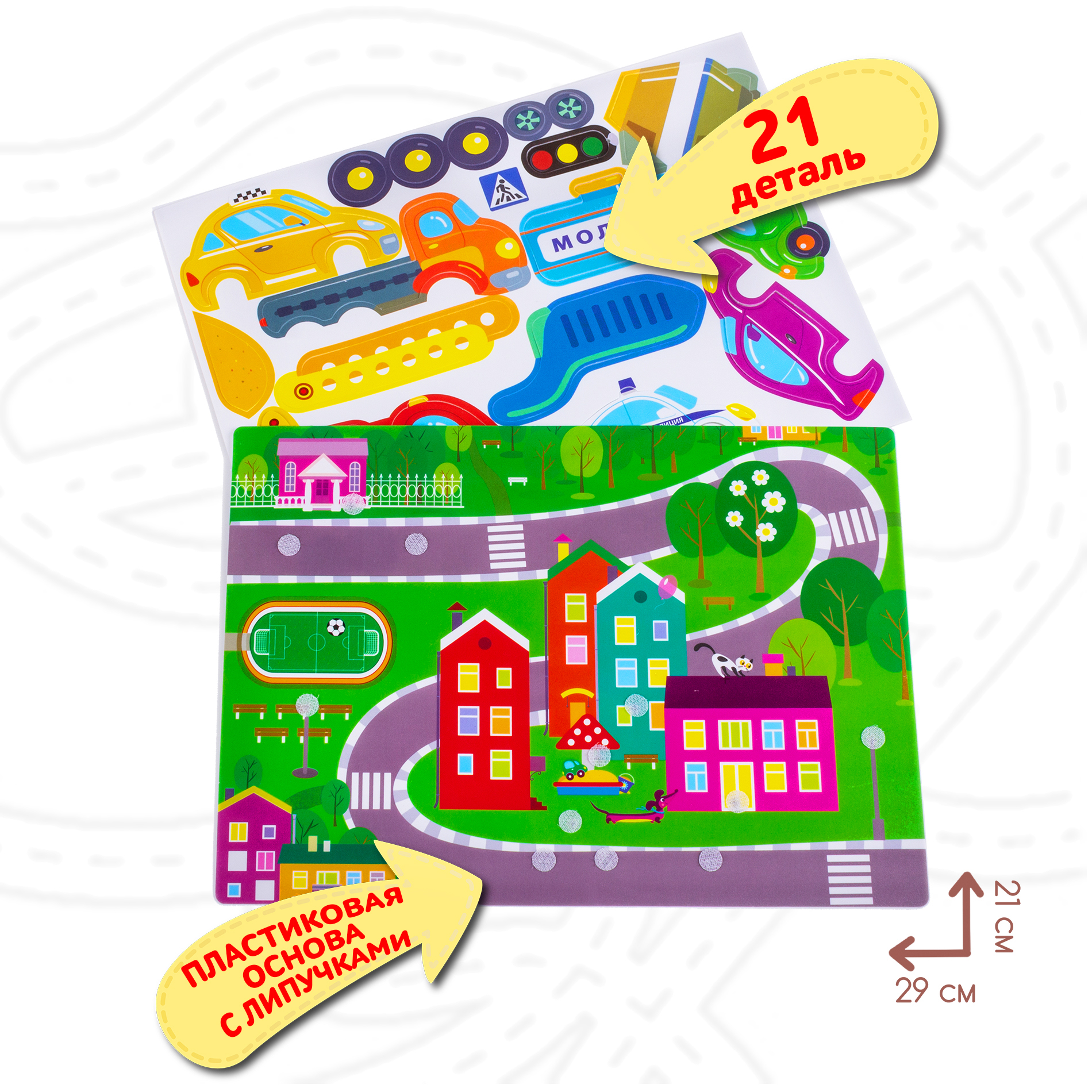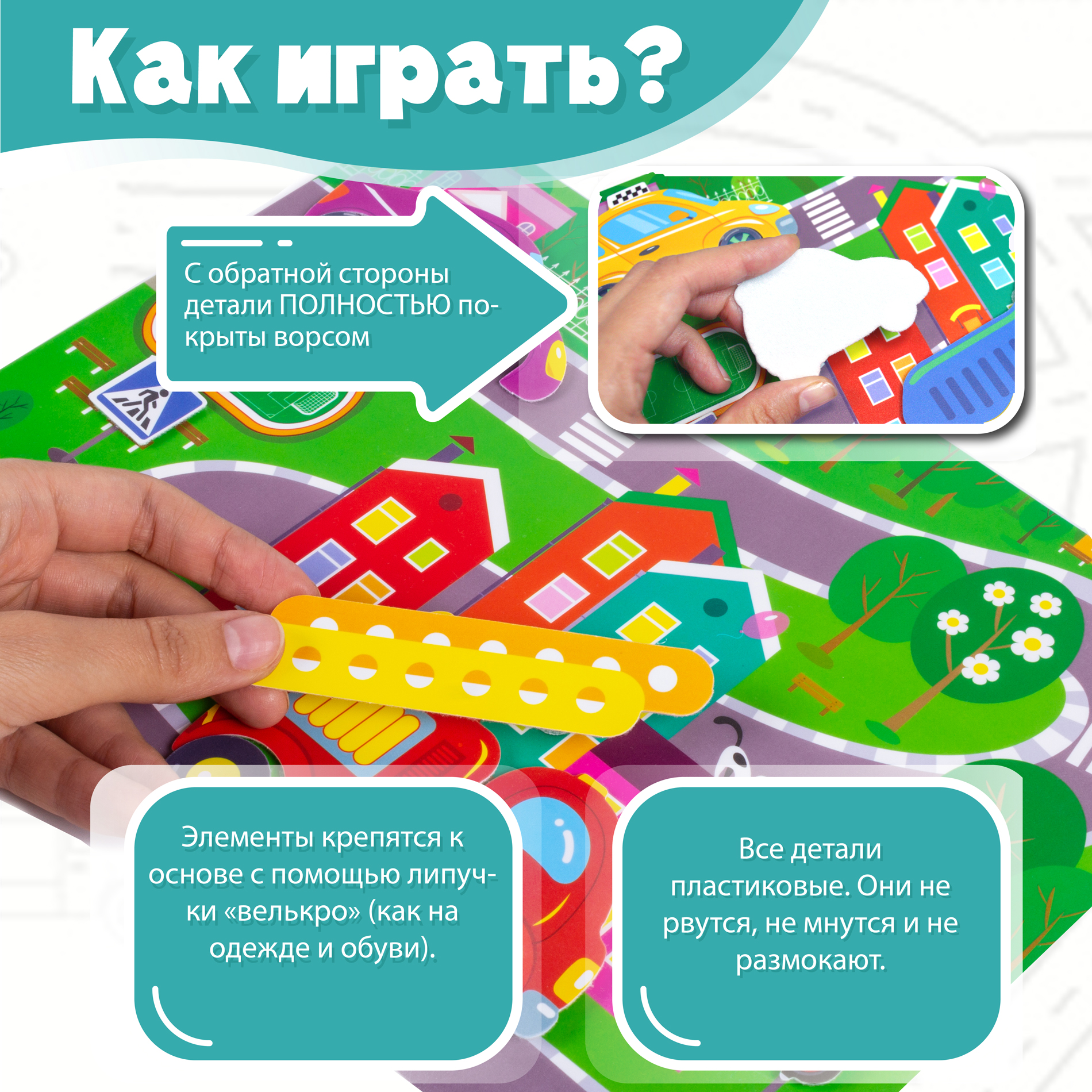 Пластиковая картинка-основа с уже приклеенными к ней липучками. Пластиковые детали с мягкой нижней поверхностью - долговечные, не рвутся, не мнутся и не размокают.