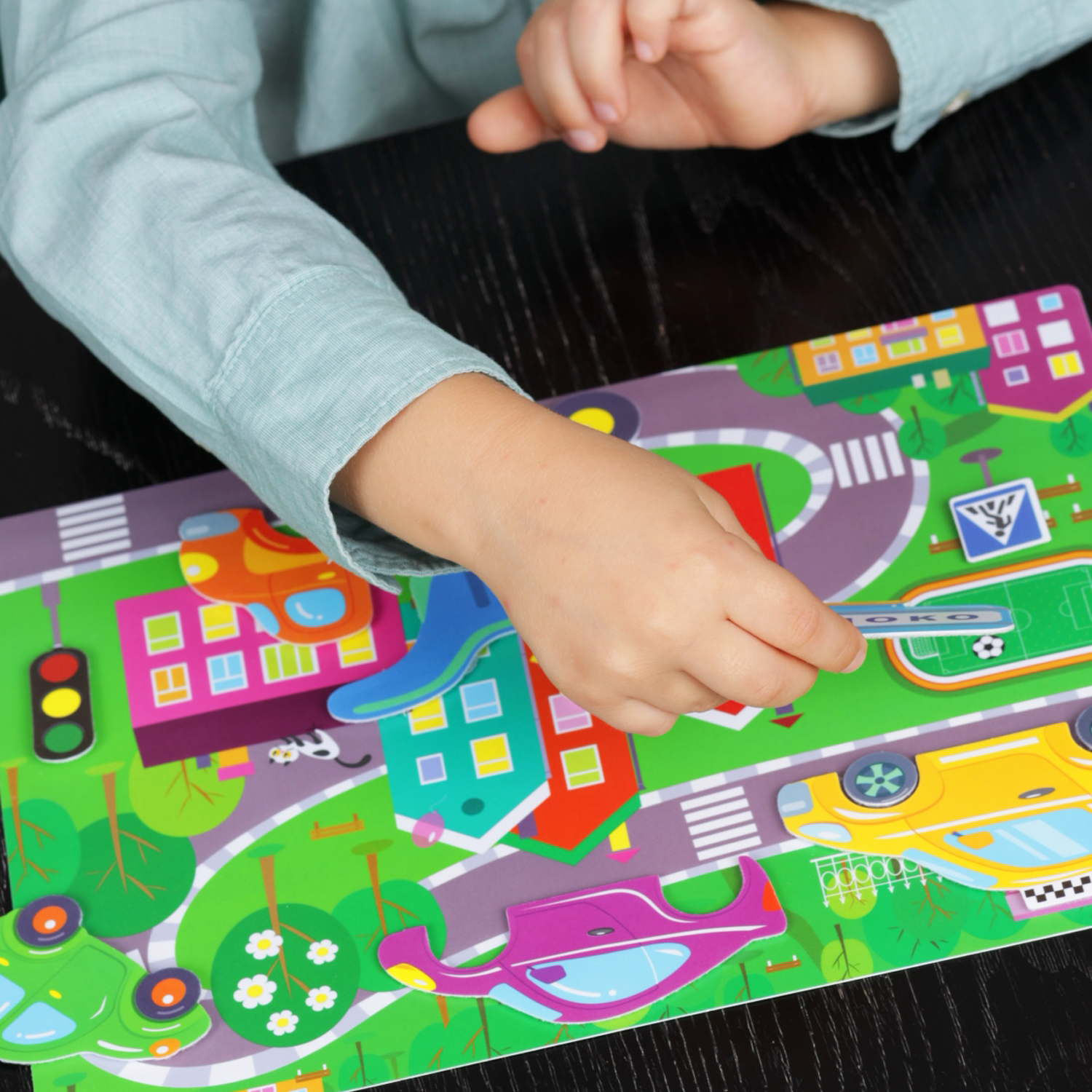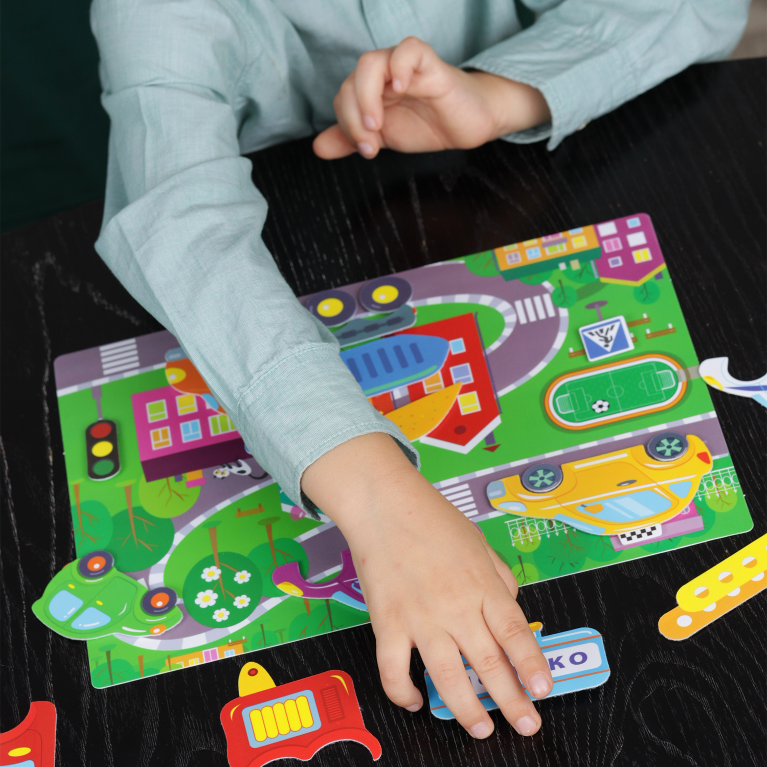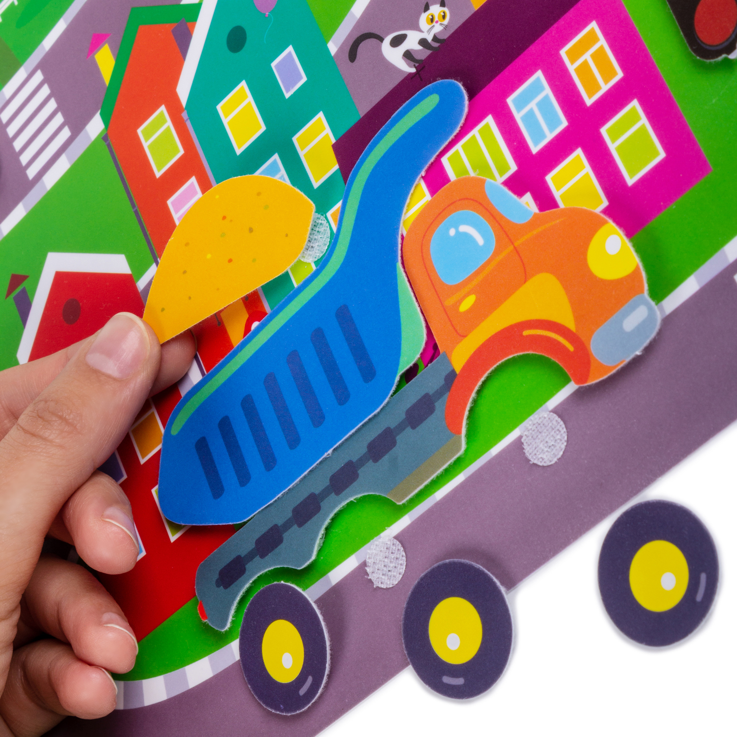 Детали крепятся к основе с помощью липучки «велькро» (как на одежде и обуви). Ребёнок может собрать из частей разные легковые и грузовые автомобили, пожарную машину, цистерну, эвакуатор, установить на поле дорожный знак и светофор.