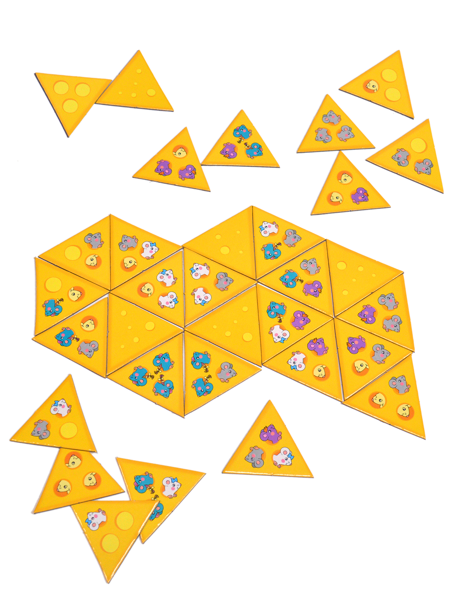 Мышки-малышки очень любят прогрызать норки в сыре! Игрокам предстоит соединить их многочисленные ходы в один большой лабиринт. Игра, похожая на домино, но в необычном «треугольном» исполнении порадует как детей, так и взрослых, поможет весело провести досуг. Задача игроков - соединять карточки таким образом, чтобы рядом оказались одинаковые мышки. Есть карты-джокеры, которые можно присоединить в любое место. Помимо классической игры для нескольких участников можно использовать как пасьянс для одного игрока.
