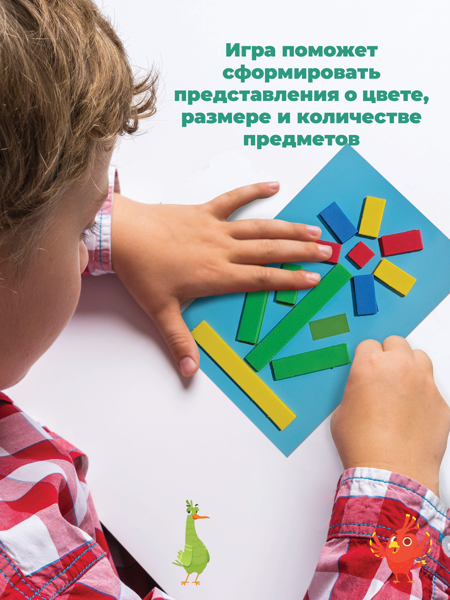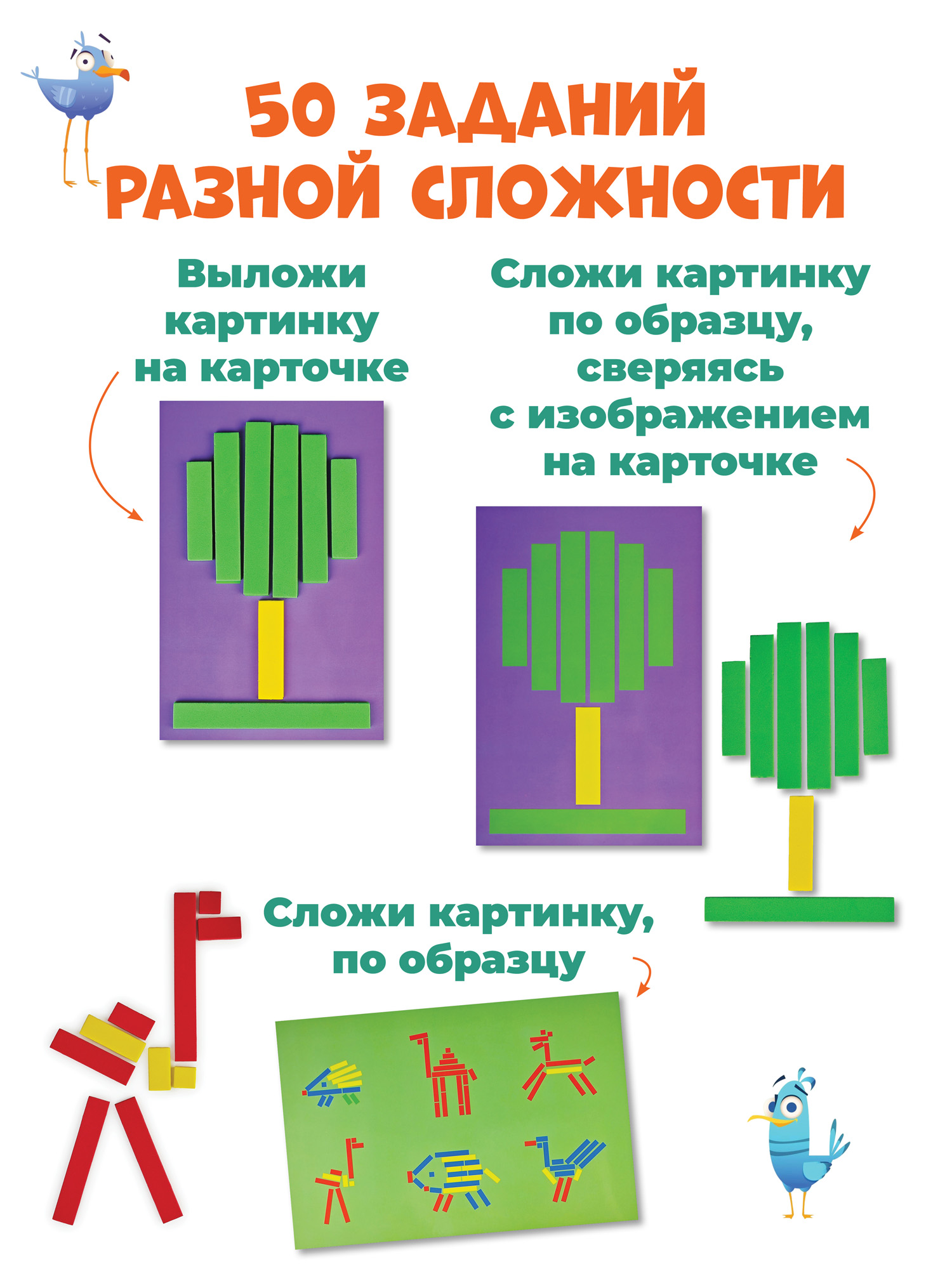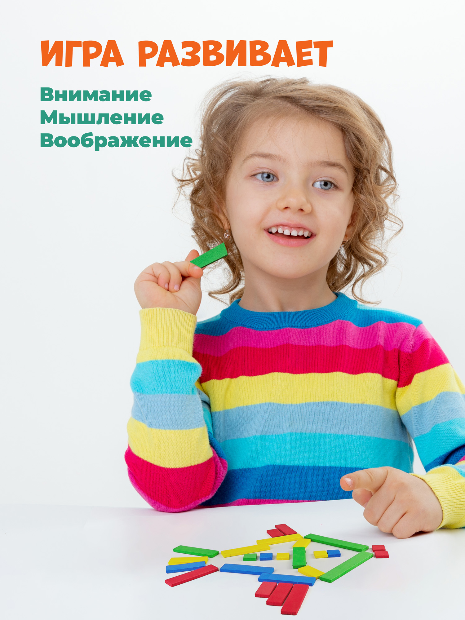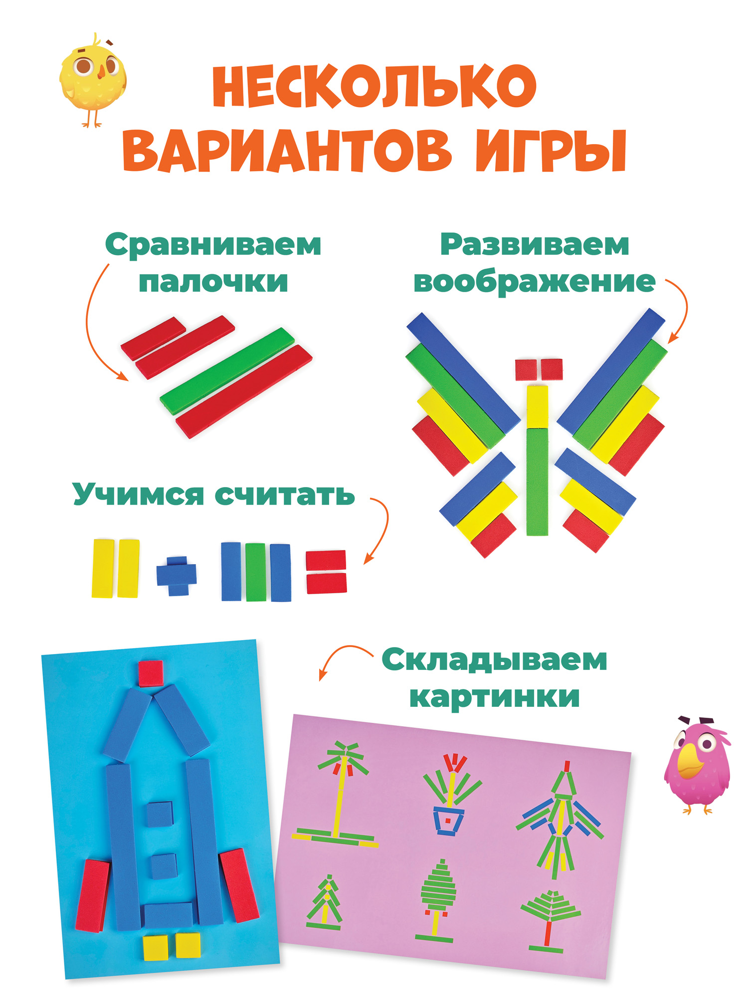 С помощью разноцветных палочек можно сложить множество картинок, используя образец или собственную фантазию. Игра развивает внимание, мышление и воображение, учит сравнивать предметы по цвету и размеру и просто приносит удовольствие!