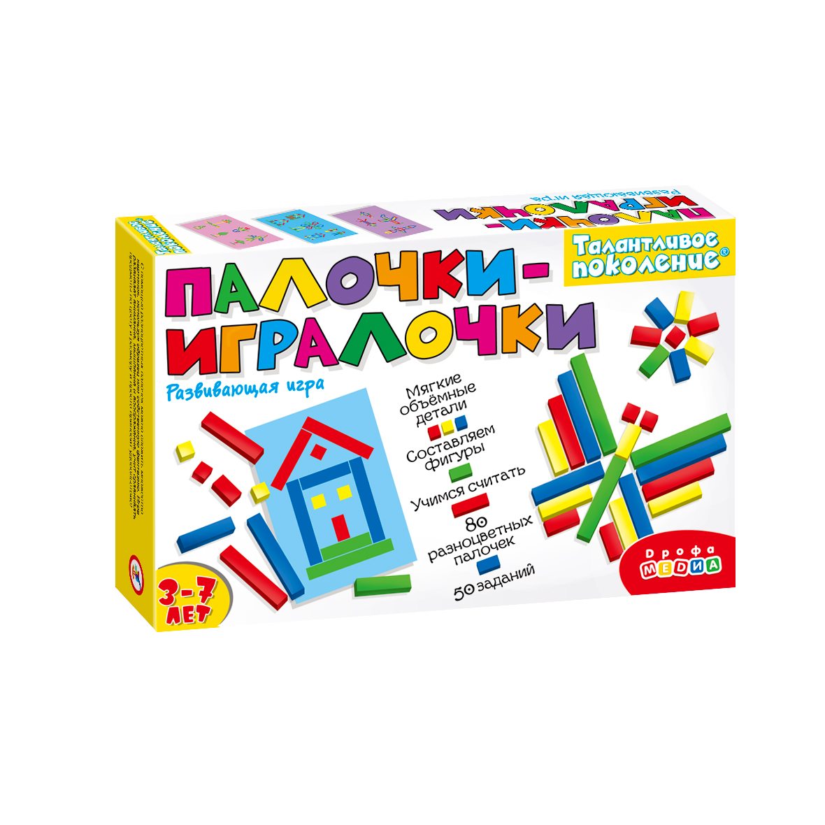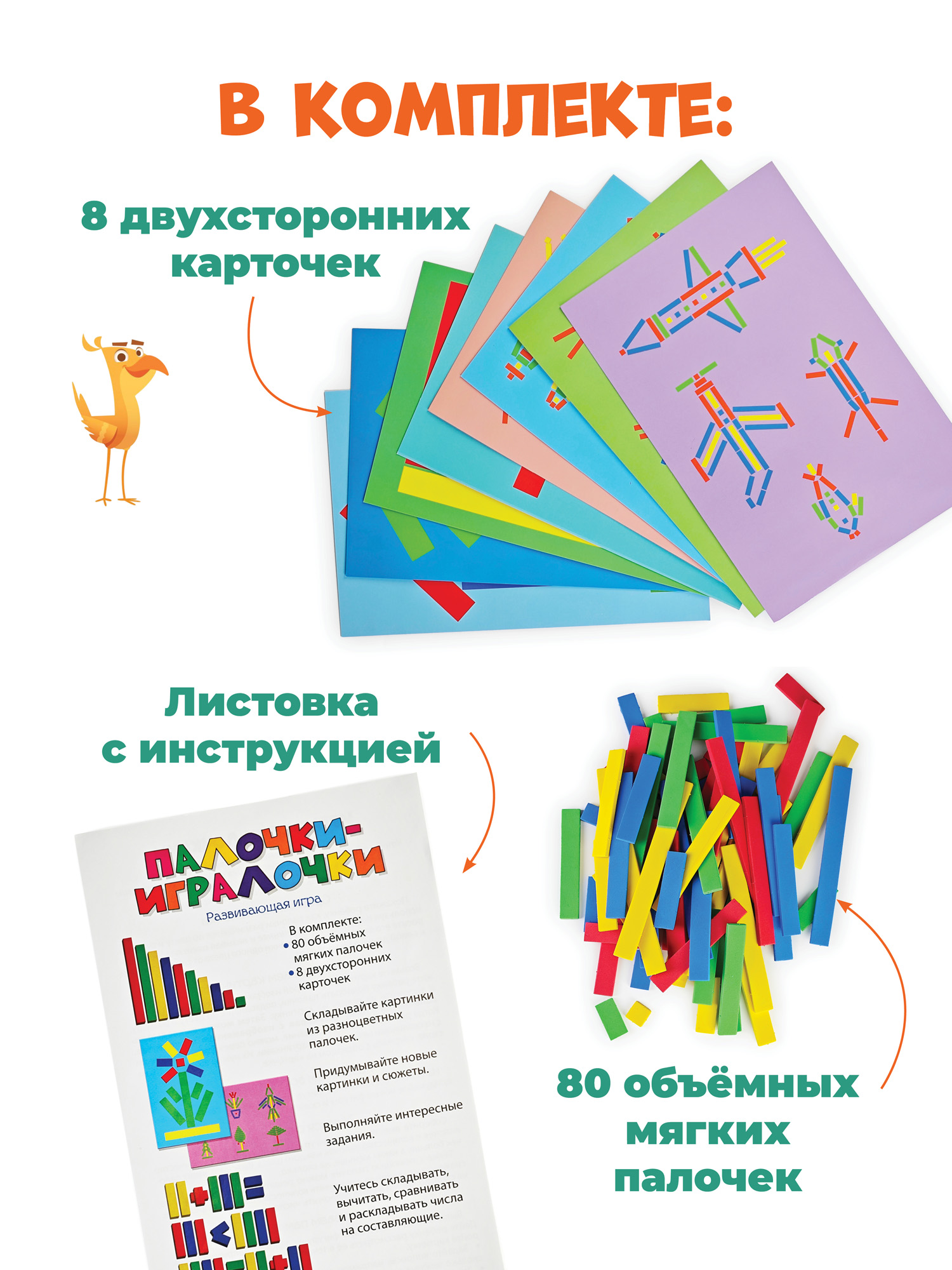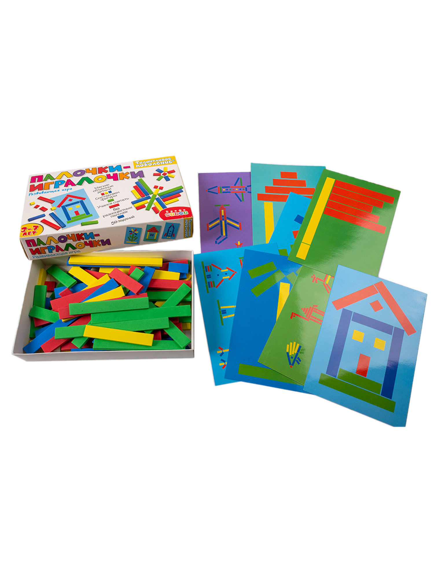 Игра понравится любителям конструктора и пригодится тем, кто хочет стать более усидчивым. Внутри вы найдёте 8 двухсторонних карточек с заданиями и 80 объёмных разноцветных палочек, приятных наощупь. С их помощью можно сложить цветные фигуры по заданию, а можно придумать свои собственные. В игре предусмотрены задания разного уровня сложности, для маленьких игроков и ребят постарше.