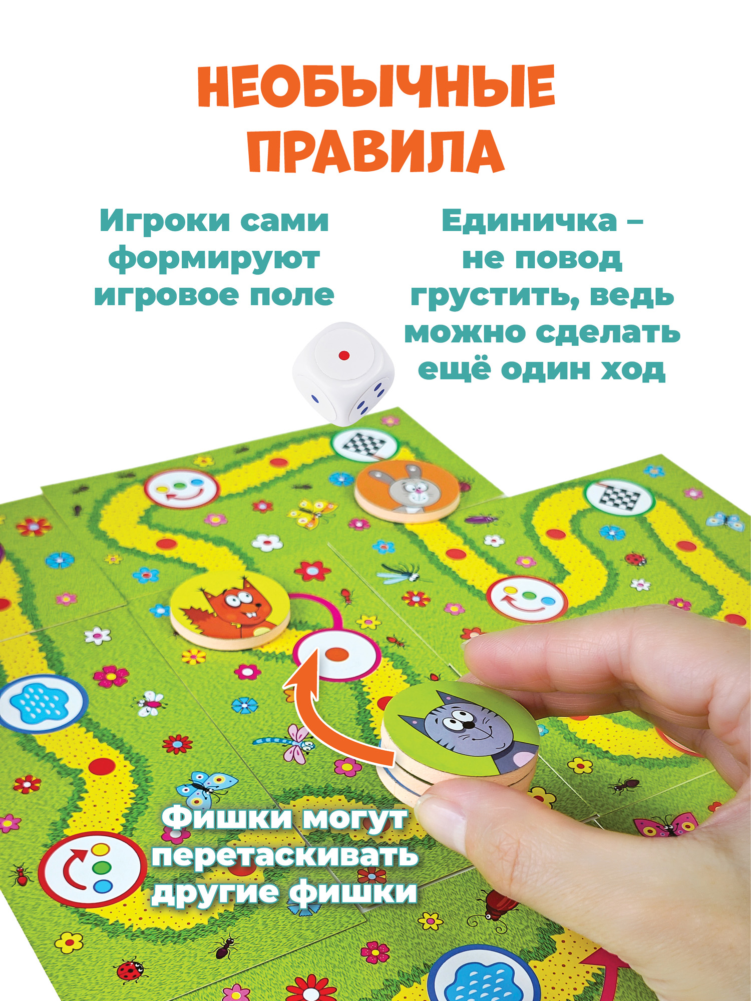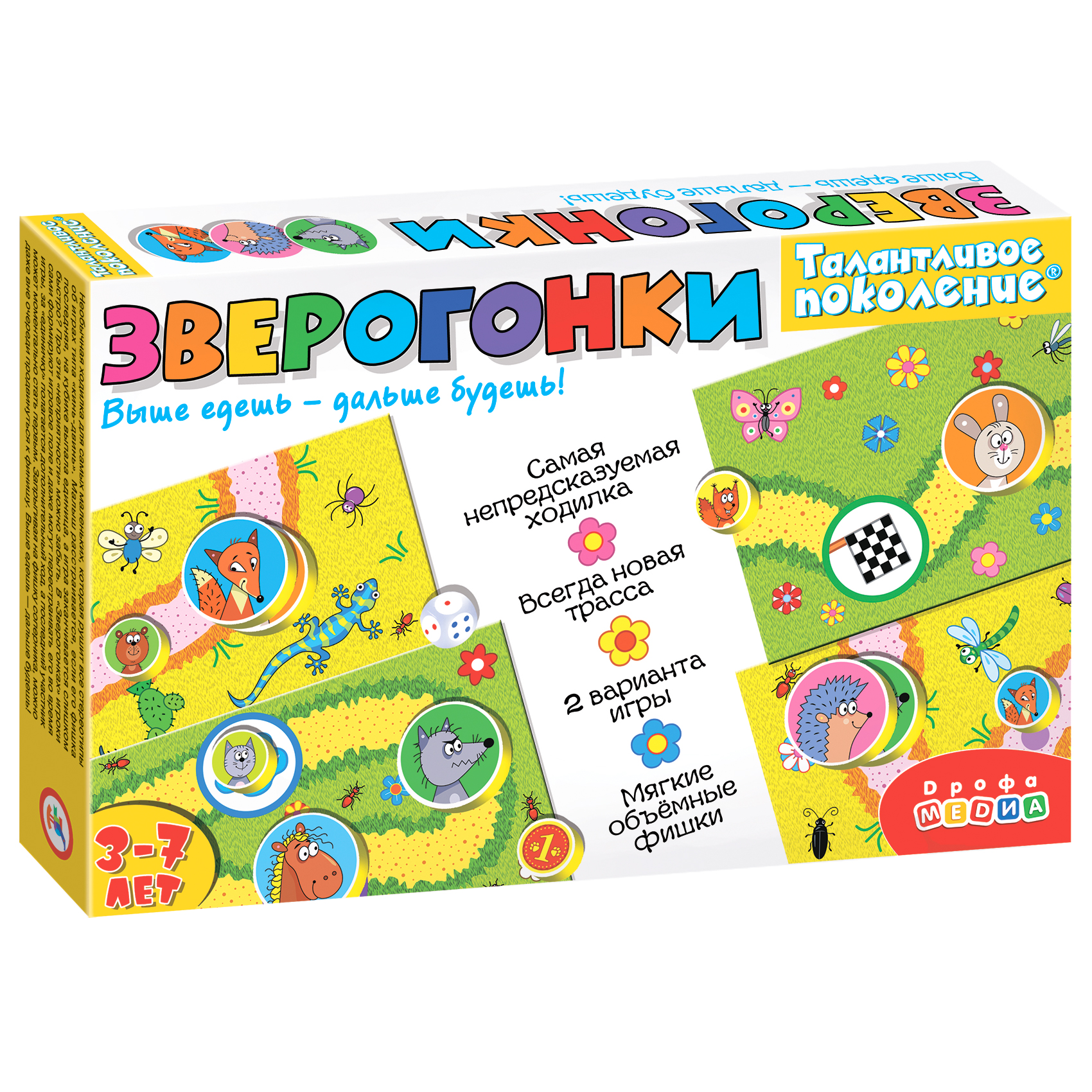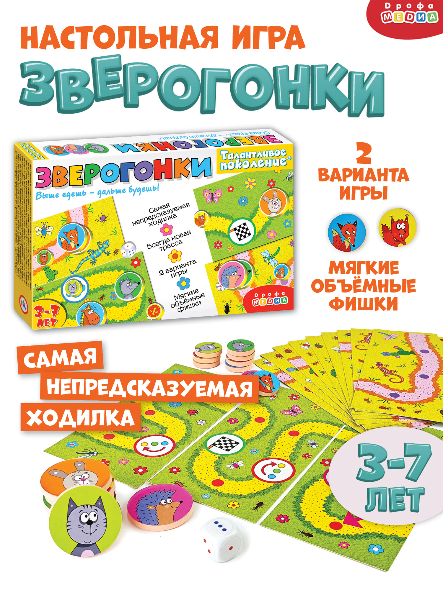 Необычная ходилка для самых маленьких, которая рушит все стереотипы об играх типа «кинь-двинь». Малыш расстраивается, если его фишка последняя, на кубике выпала единица, а игра заканчивается слишком быстро? Про эти «неприятности» можно забыть. В «Зверогонках» игроки сами формируют игровое поле (всегда новое!) и даже могут перестраивает его во время игры, за выпавшую «единичку» полагается дополнительный ход, а последний участник может моментально стать первым. Запрыгивая на фишку соперника, можно даже вне очереди продвинуться к финишу.
