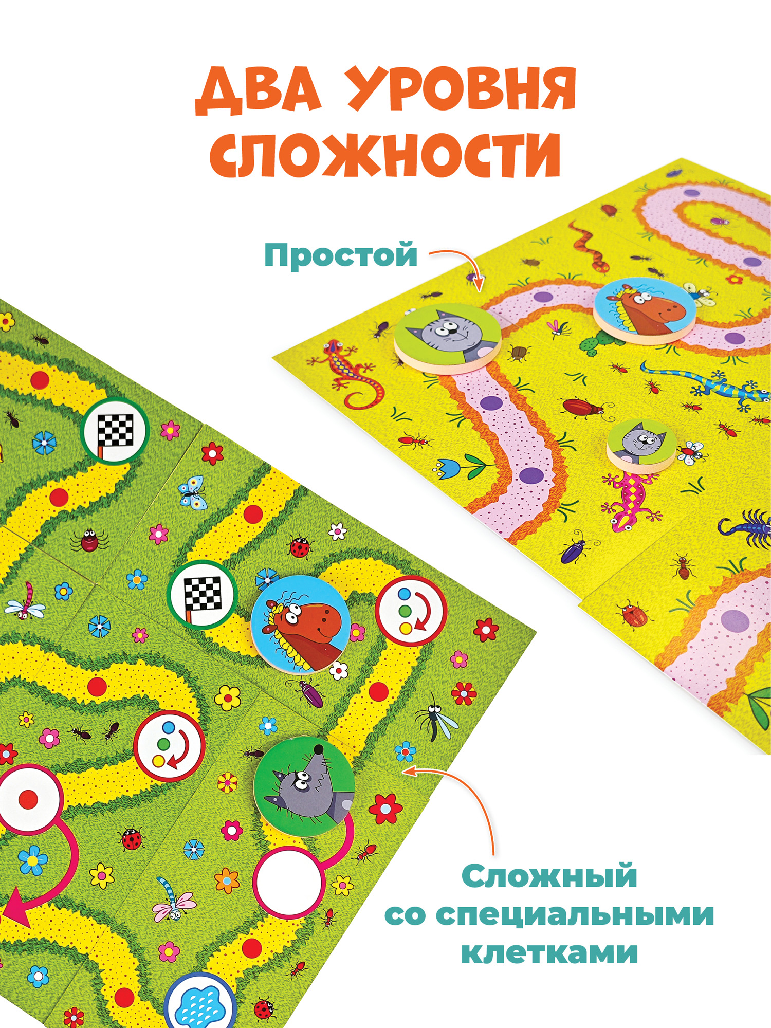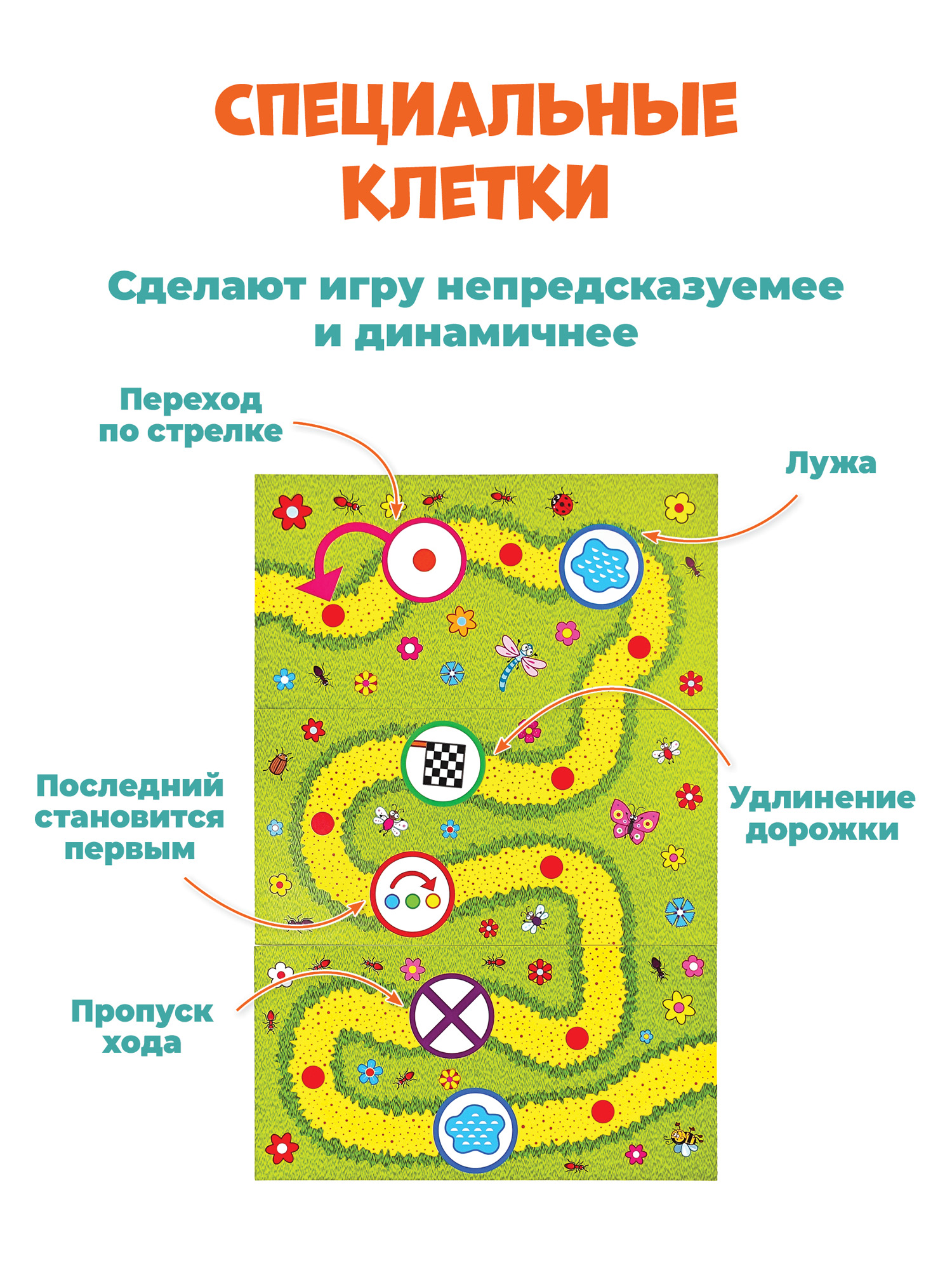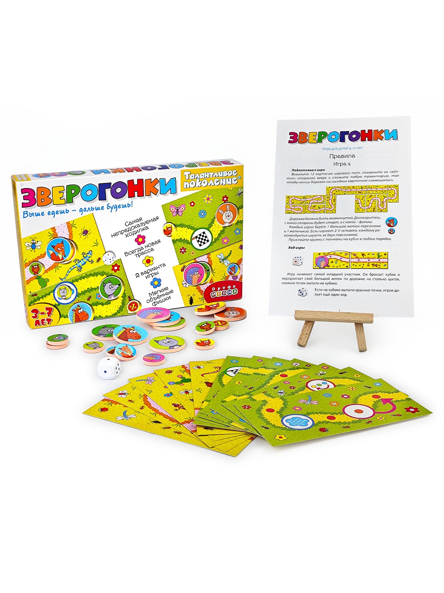 Необычная ходилка для самых маленьких, которая рушит все стереотипы об играх типа «кинь-двинь». Малыш расстраивается, если его фишка последняя, на кубике выпала единица, а игра заканчивается слишком быстро? Про эти «неприятности» можно забыть. В «Зверогонках» игроки сами формируют игровое поле (всегда новое!) и даже могут перестраивает его во время игры, за выпавшую «единичку» полагается дополнительный ход, а последний участник может моментально стать первым. Запрыгивая на фишку соперника, можно даже вне очереди продвинуться к финишу.