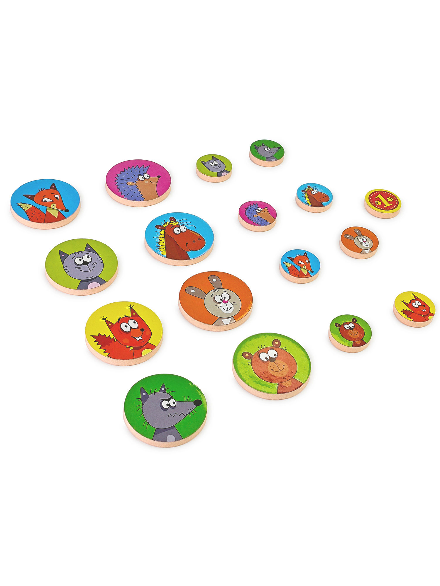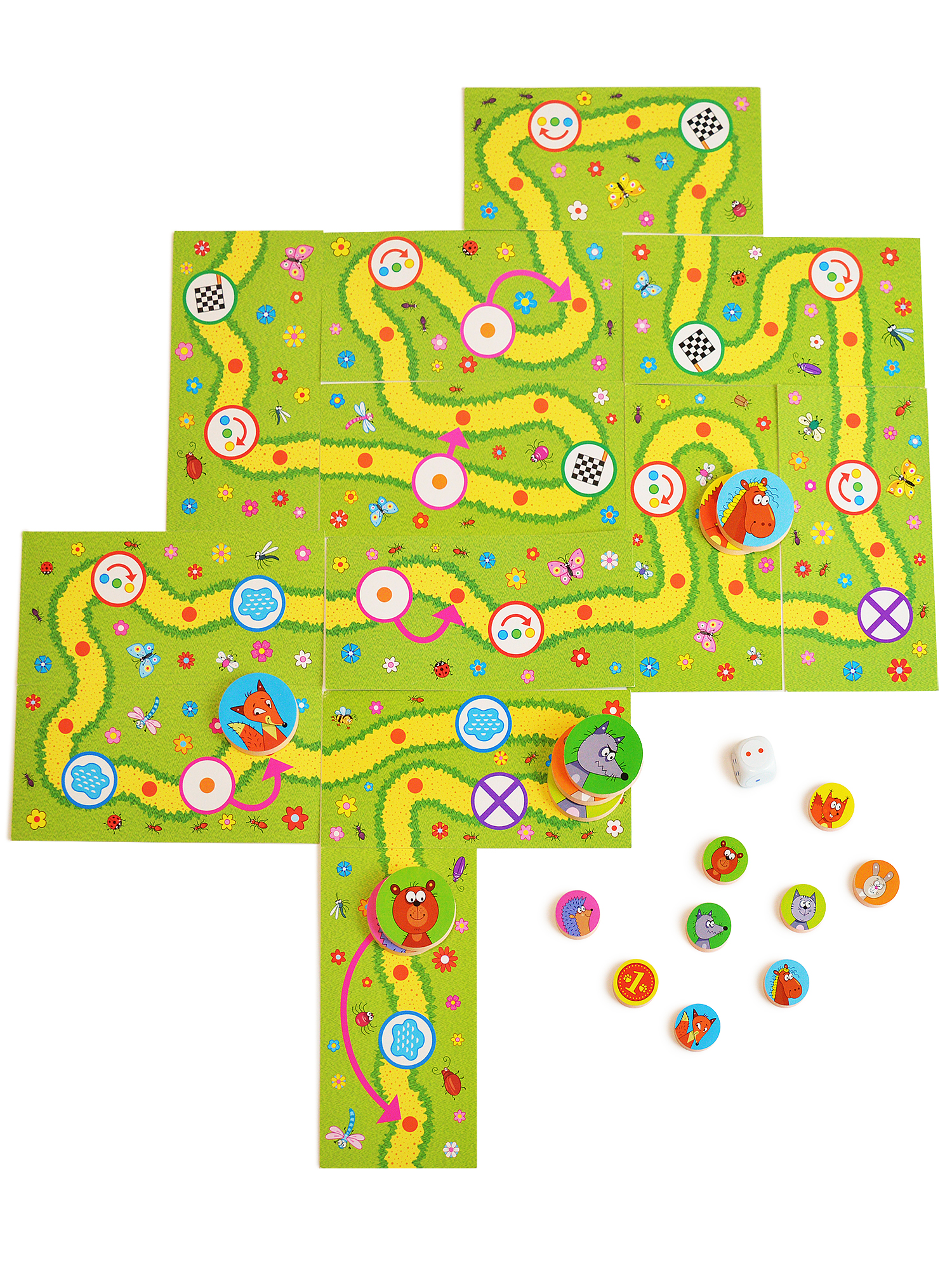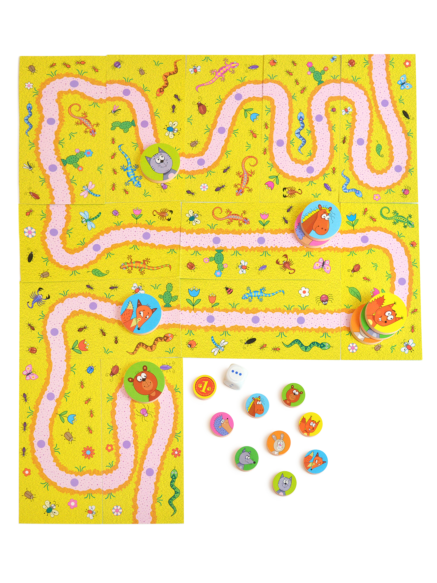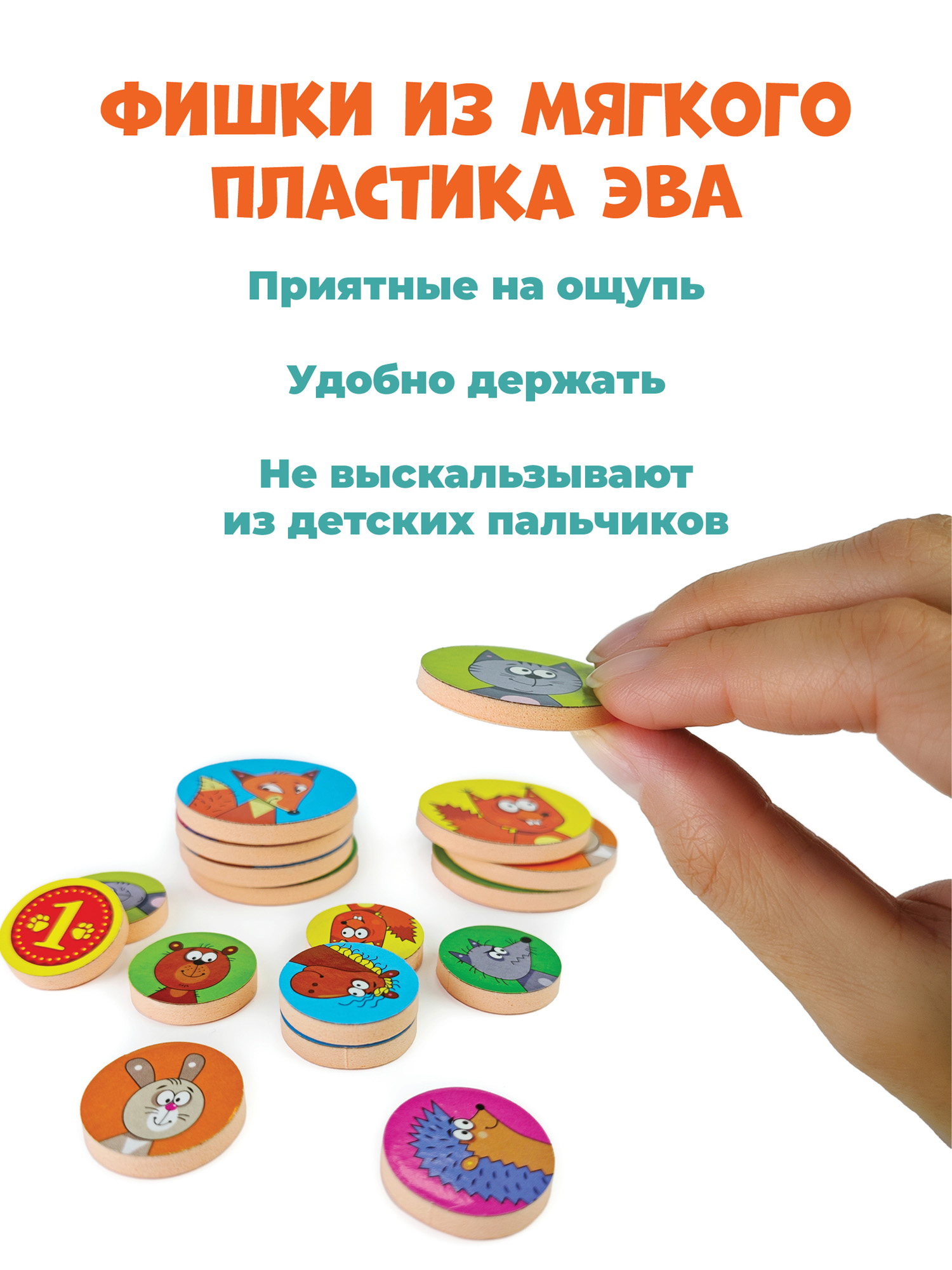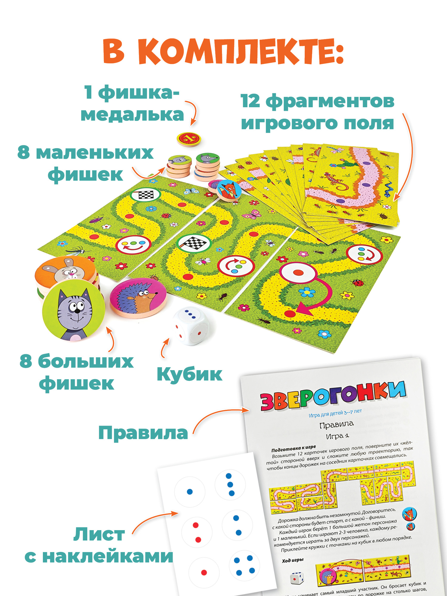 В комплекте: игровое поле из 12 фрагментов, 8 больших и 8 маленьких фишек из мягкого пластика ЭВА, кубик, лист с наклейками и правила.