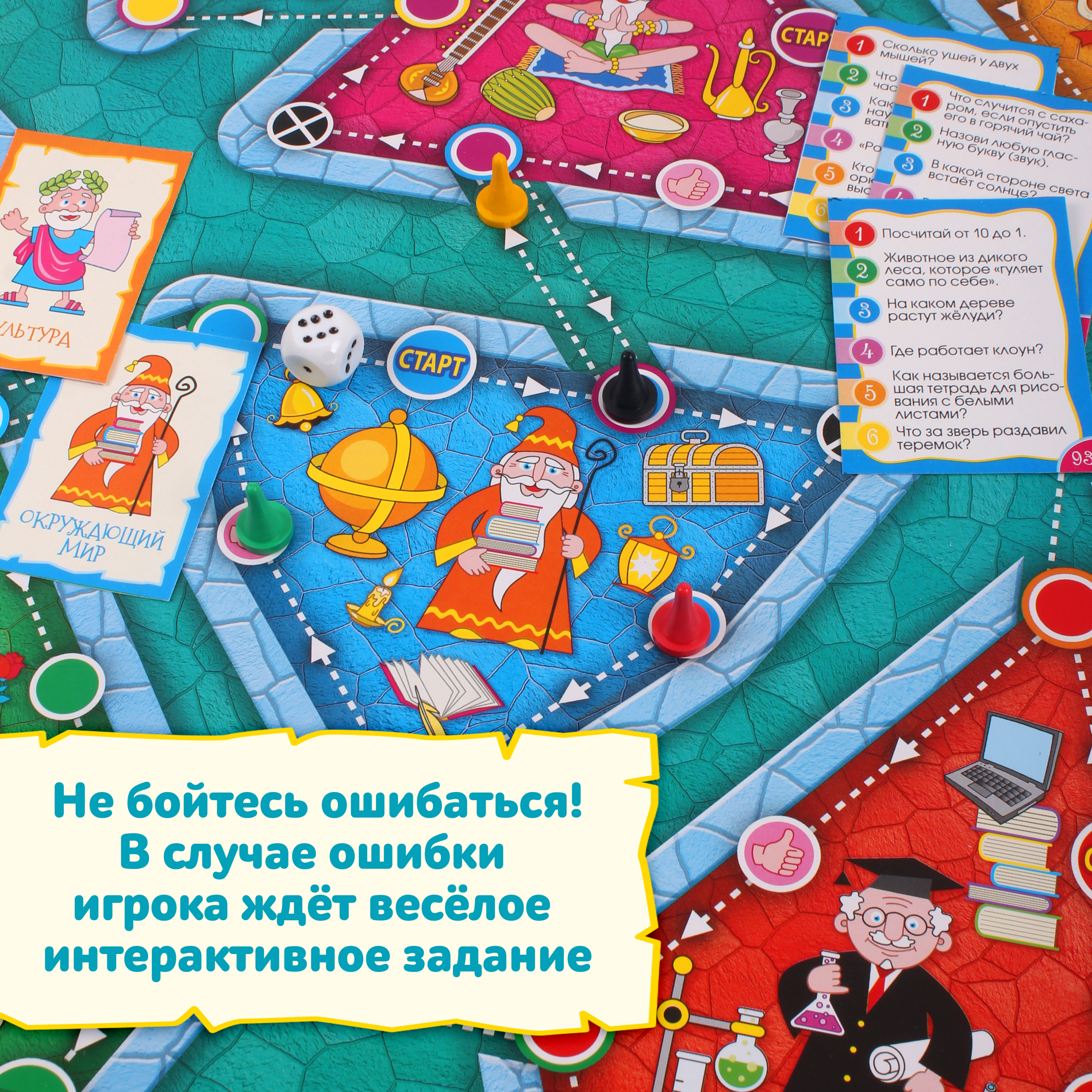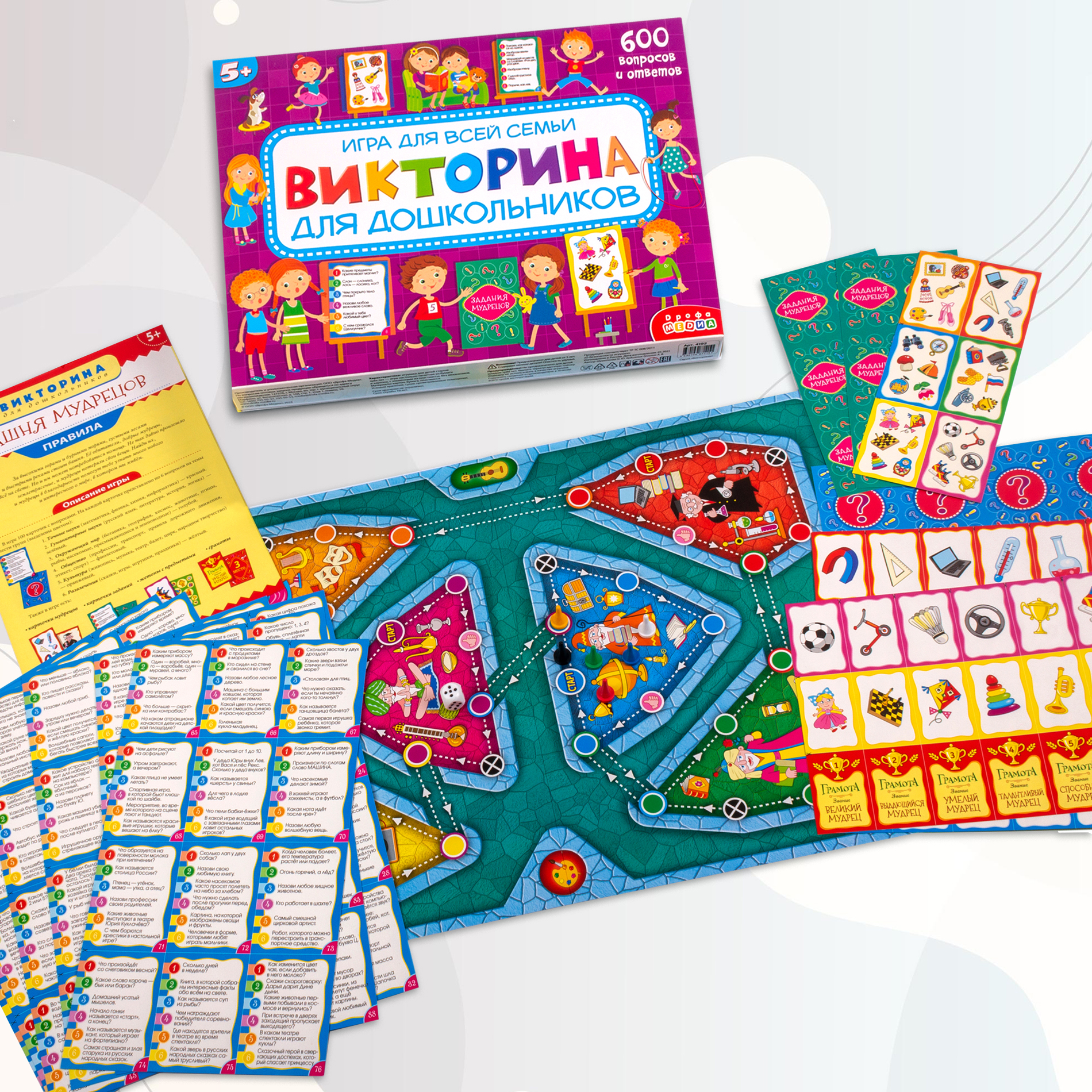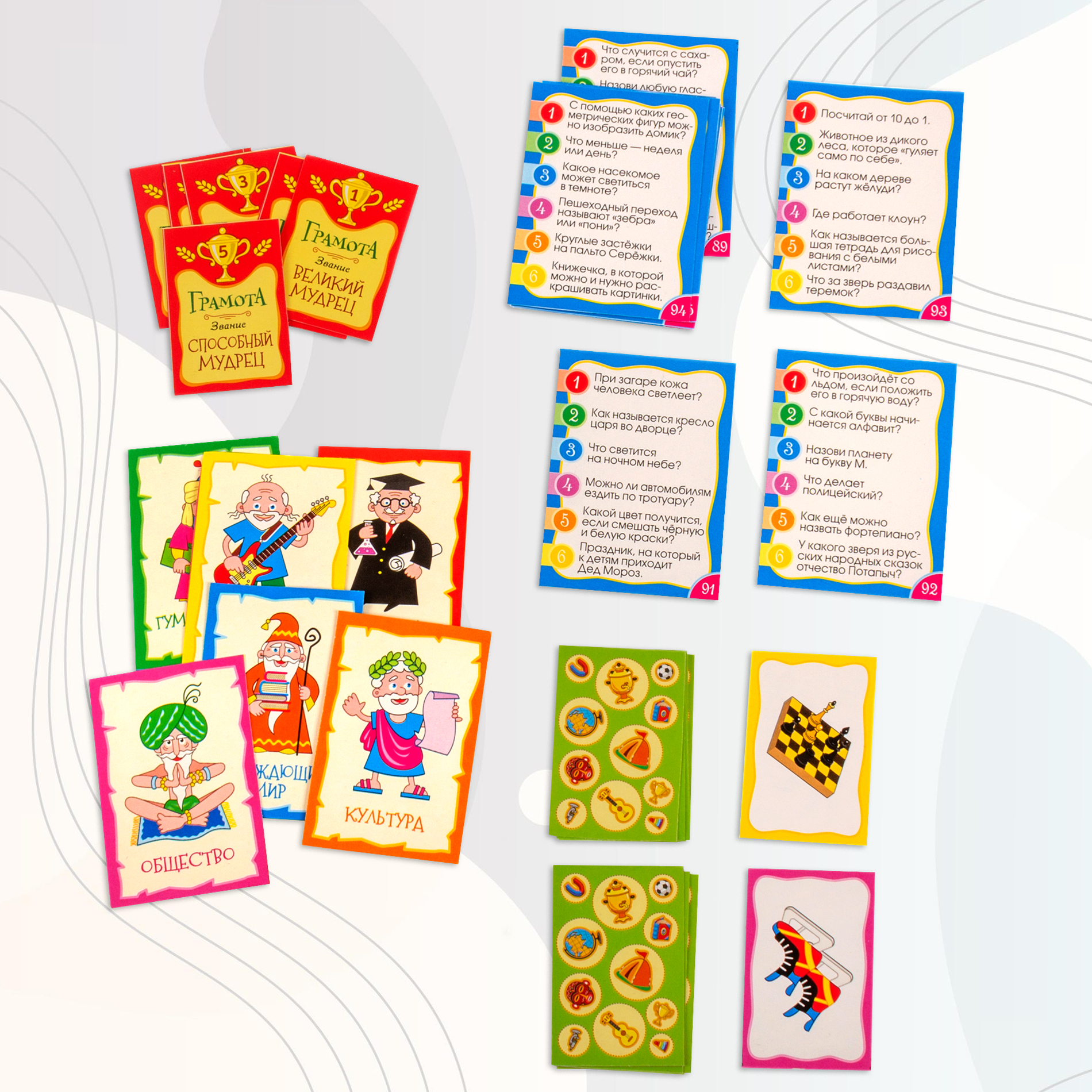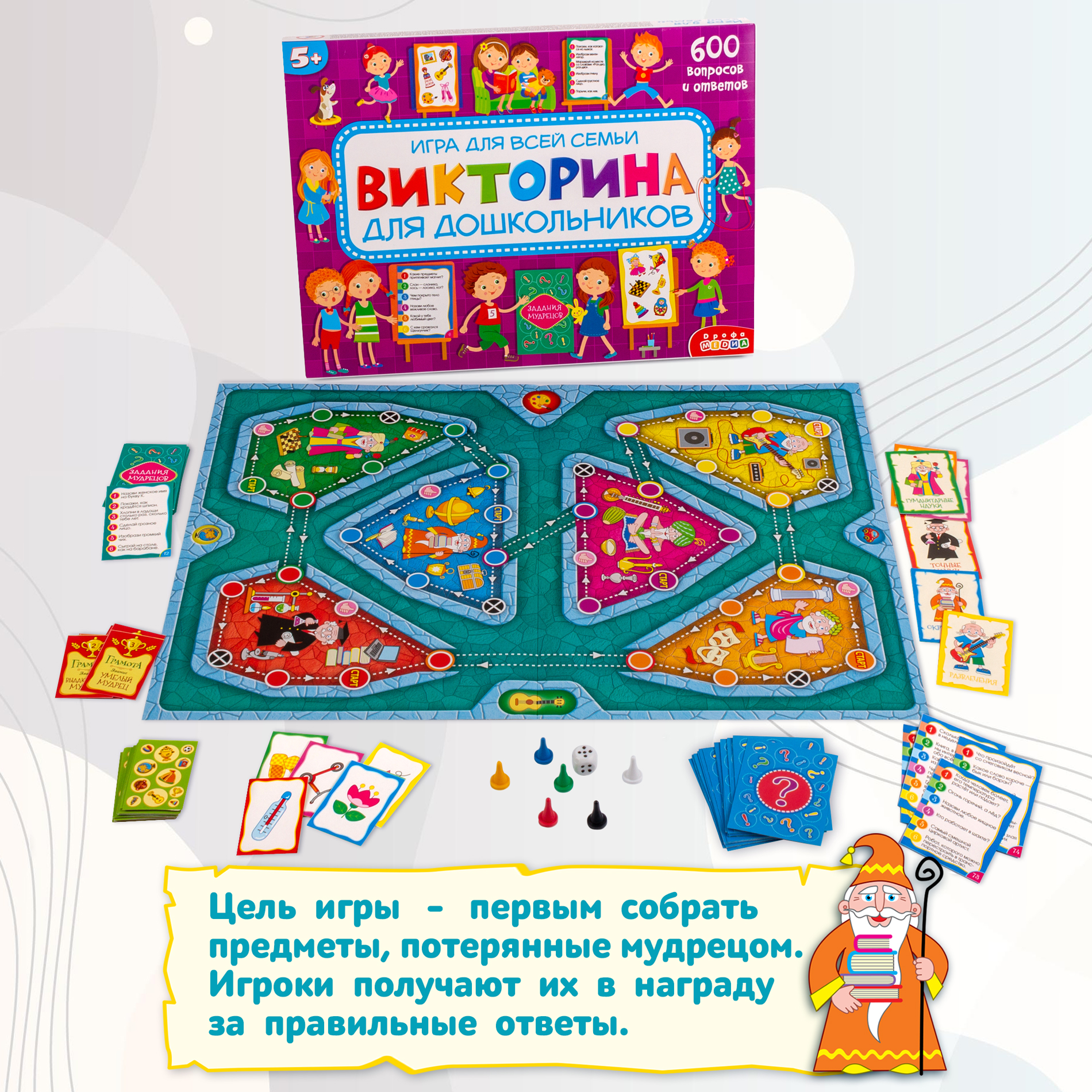 В комплекте: игровое поле, 100 карточек с вопросами, 6 карточек мудрецов, 12 карточек с заданиями, 36 жетонов с предметами, 6 грамот, цветной буклет с правилами и ответами, кубик и 6 фишек.