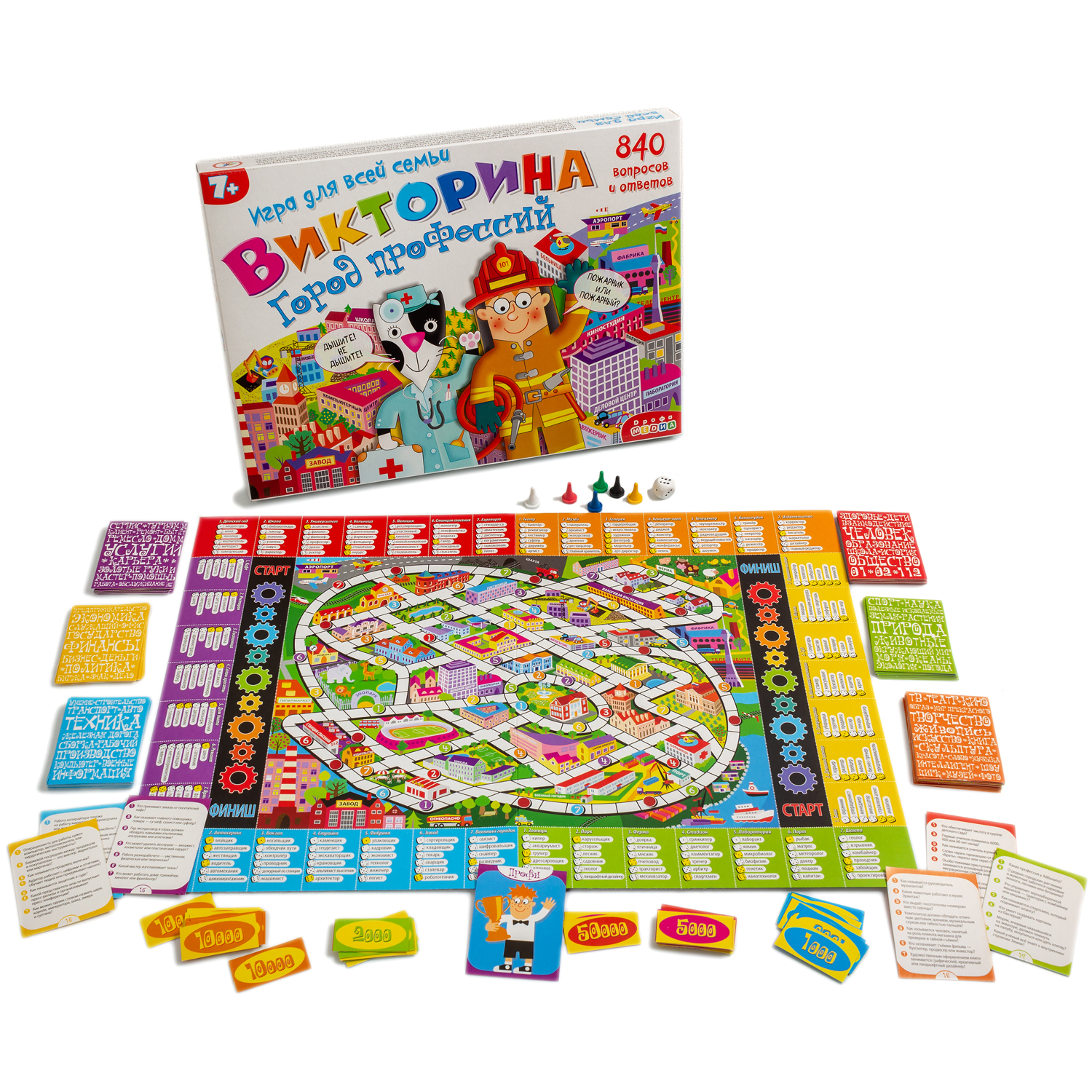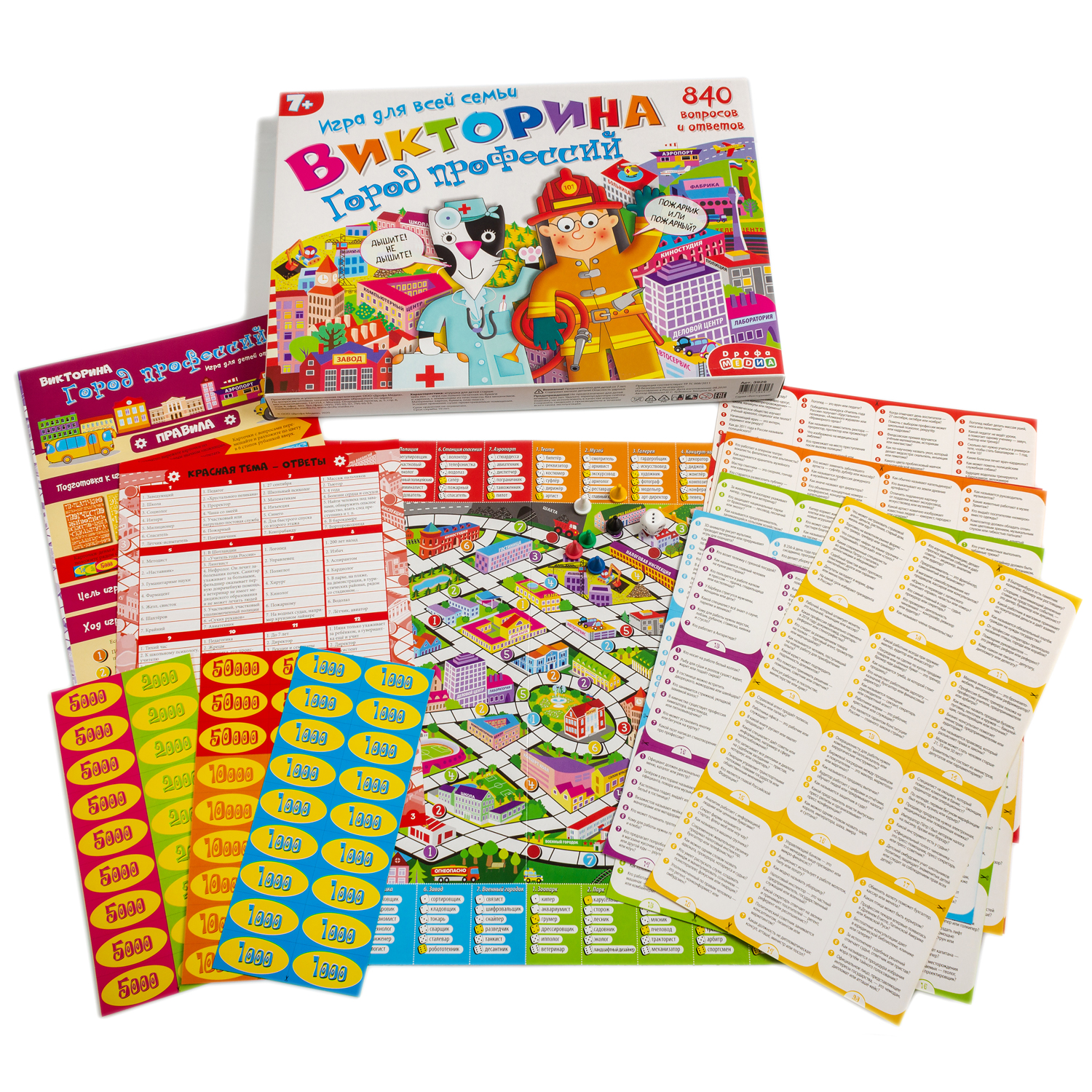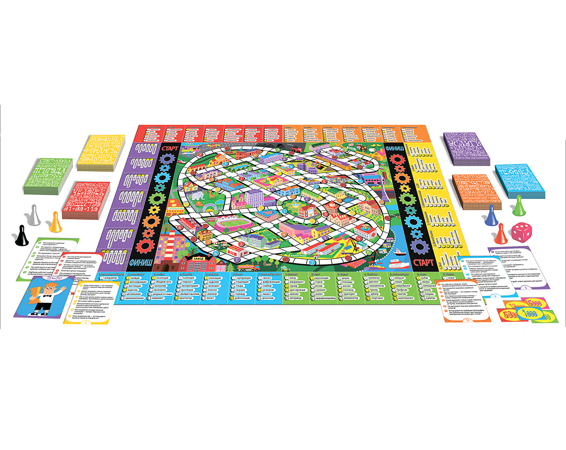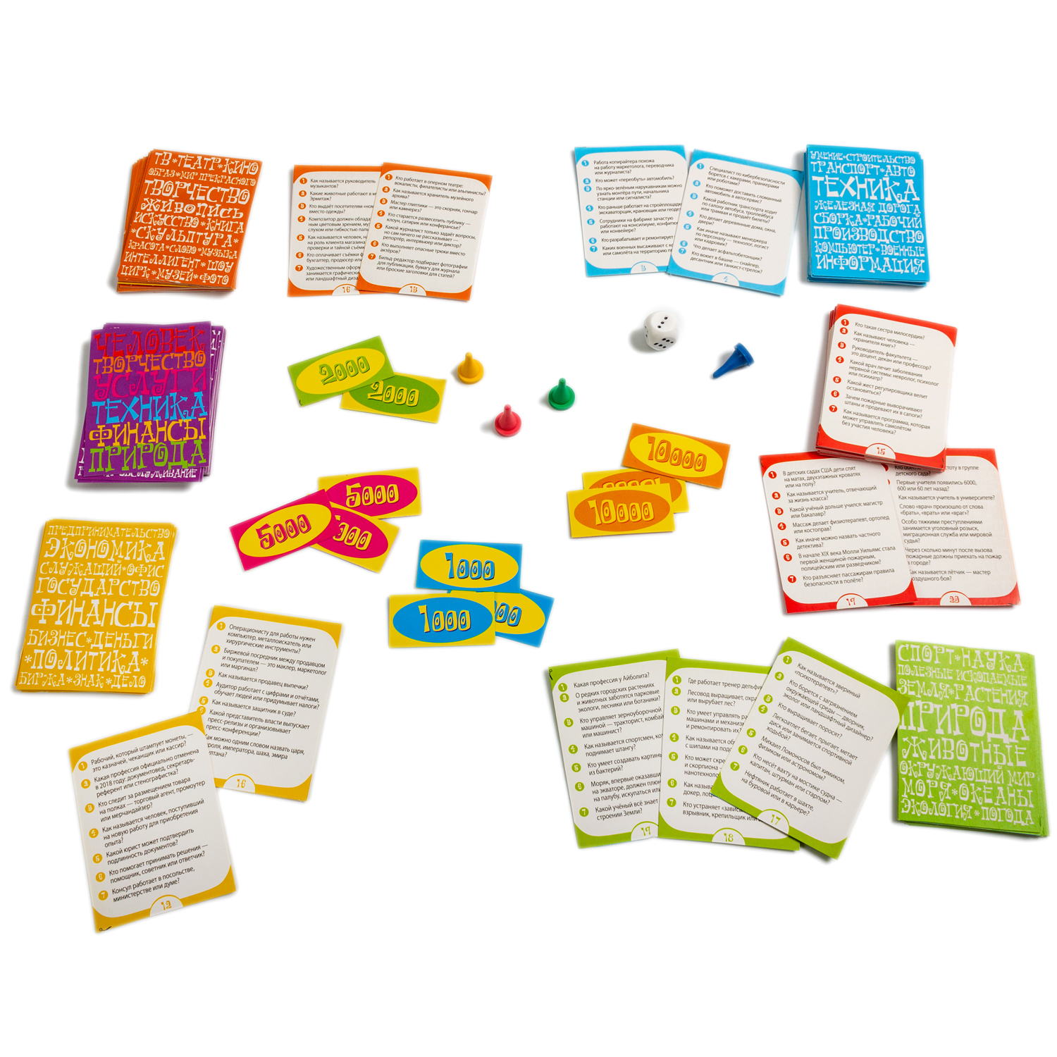 В комплекте: игровое поле, 120 карточек с вопросами, 48 карточек с деньгами, призовая карточка, 6 фишек, кубик, правила с ответами.