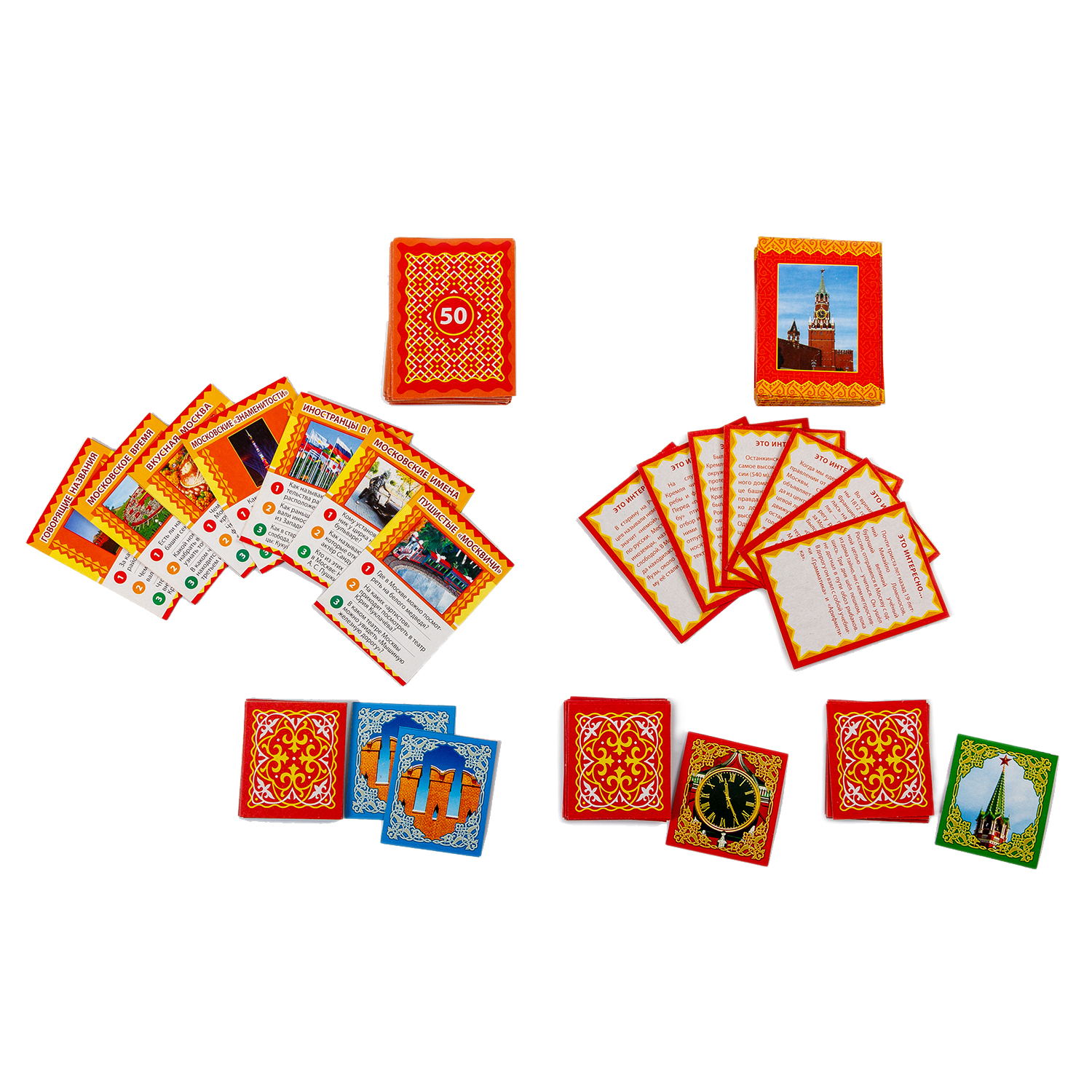 В комплекте: игровое поле, 56 карточек с вопросами, 54 карточки с занимательными фактами, 36 призовых карточек, 6 фишек, кубик, правила, ответы на вопросы.