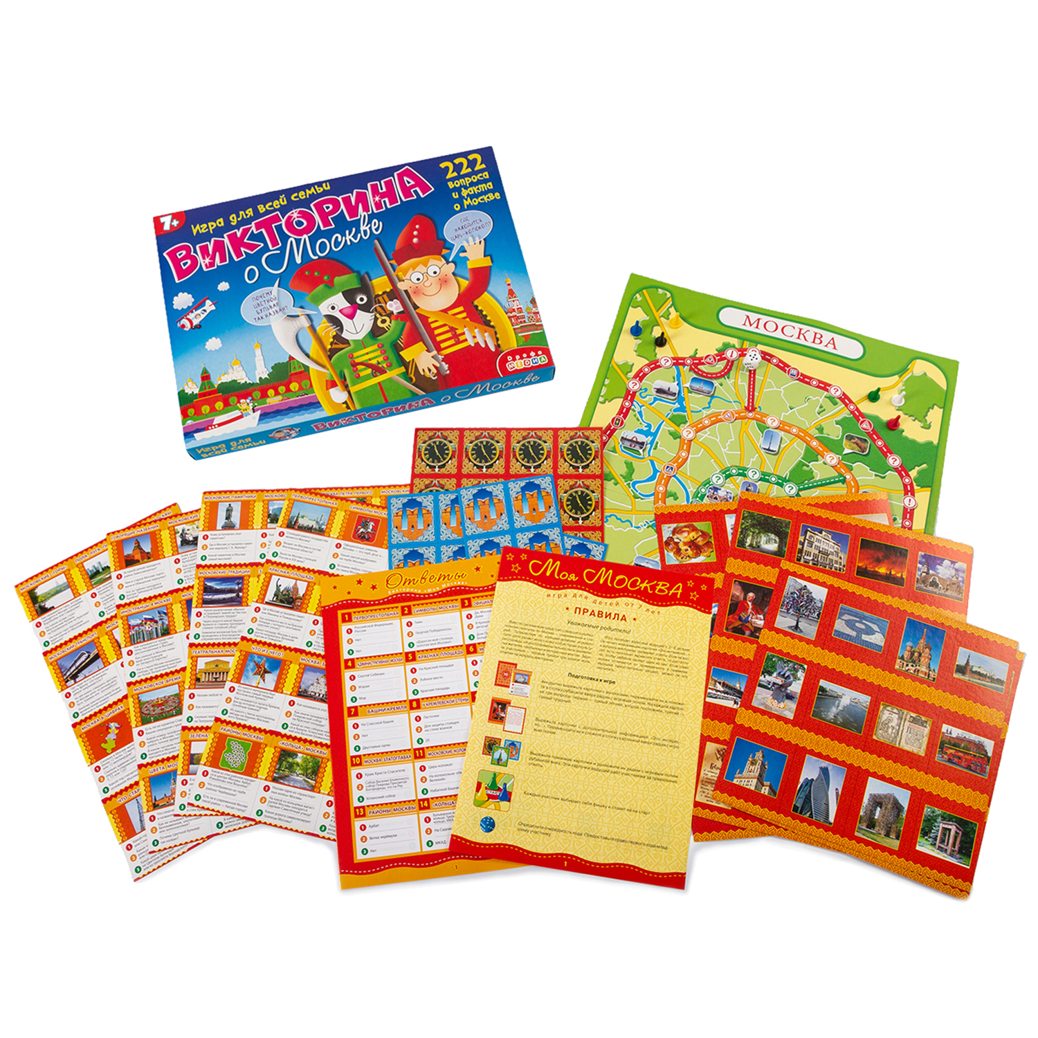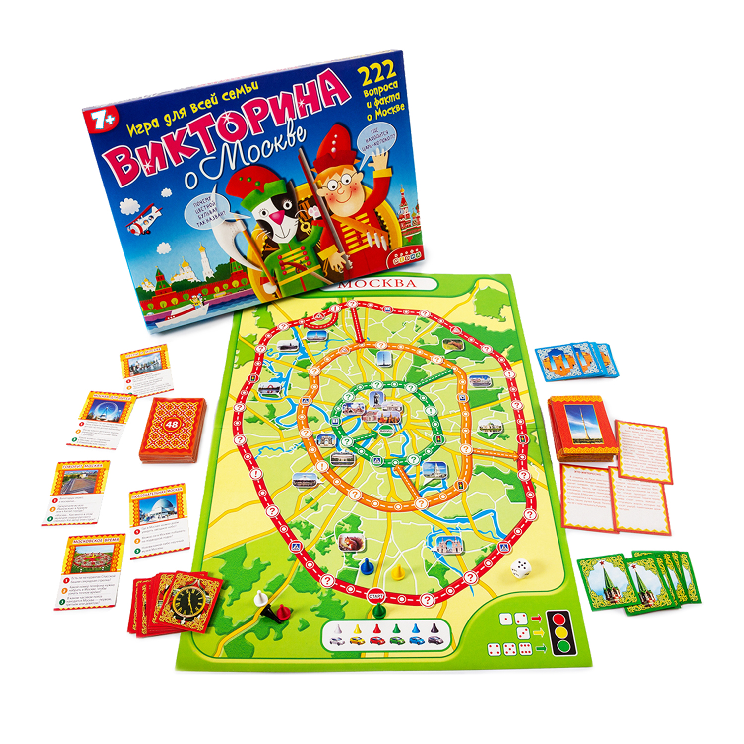 Увлекательная и познавательная игра для детей и взрослых. Содержит в себе игровое поле, карточки с вопросами (в каждой карточке - три уровня вопросов, рассортированных по цветам: зеленый, желтый и красный, и сложности) - 56 штук, карточки с ответами, содержащими исторические факты о Москве, а также призовые карточки, фишки и кубик. Рекомендую!