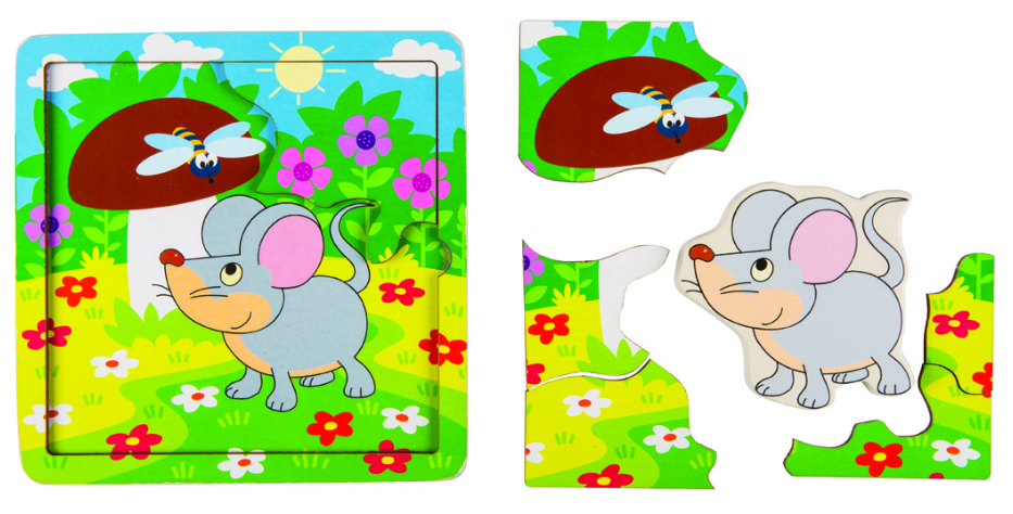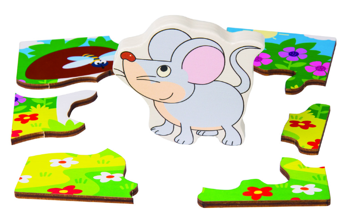 В состав игры входит объемная деревянная фигурка мышки. Её можно вложить в пазл, а также играть отдельно. На картинке изображено много деталей, которые ребенок сможет рассматривать и называть. Родители же помогут ему наводящими вопросами — например, какого цвета шляпка у грибочка на картинке?