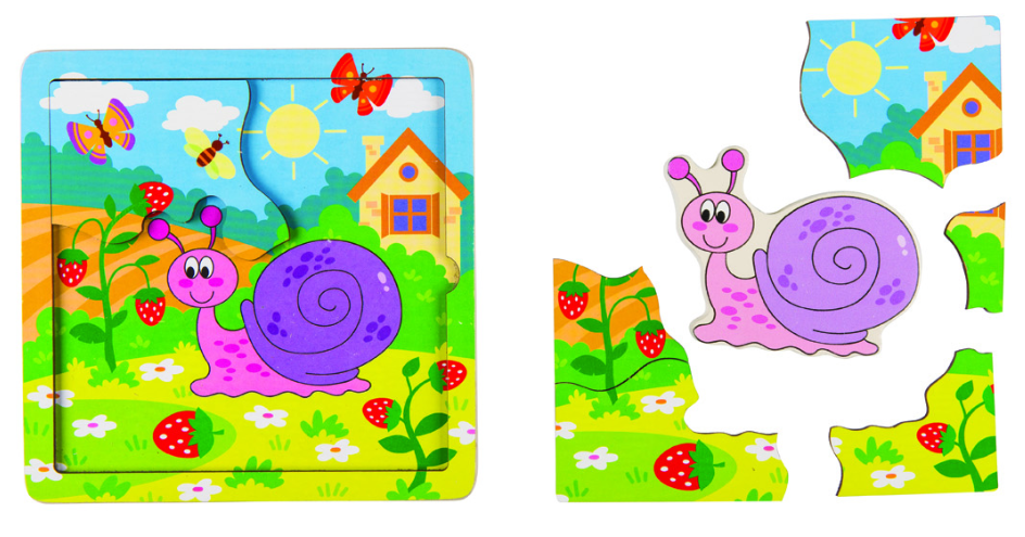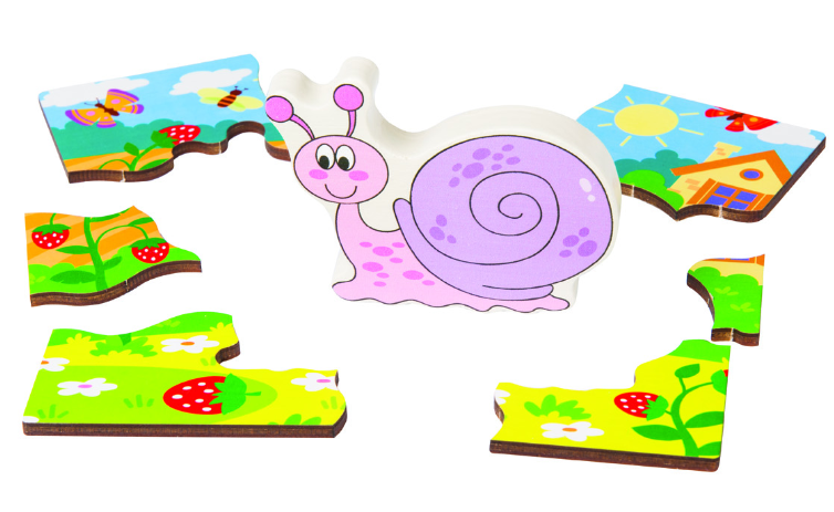 В состав игры входит объемная деревянная фигурка улитки. Её можно вложить в пазл, а также играть отдельно. На картинке изображено много деталей, которые ребенок сможет рассматривать и называть. Родители же помогут ему наводящими вопросами — например, каких цветов крылья у бабочек?