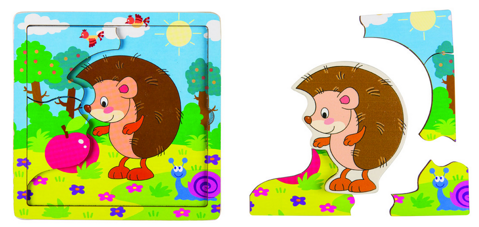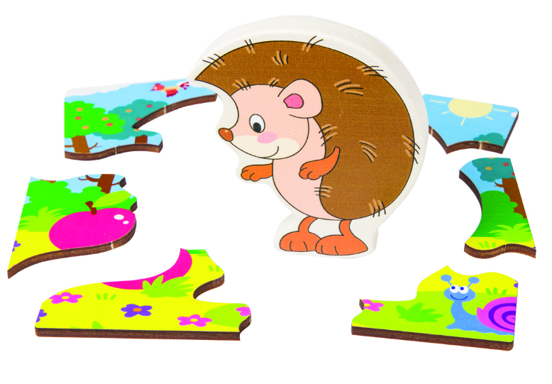 В состав игры входит объемная деревянная фигурка ёжика. Её можно вложить в пазл, а также играть отдельно. На картинке изображено много деталей, которые ребенок сможет рассматривать и называть. Родители же помогут ему наводящими вопросами — например, сколько птичек ты видишь ещё на картинке?