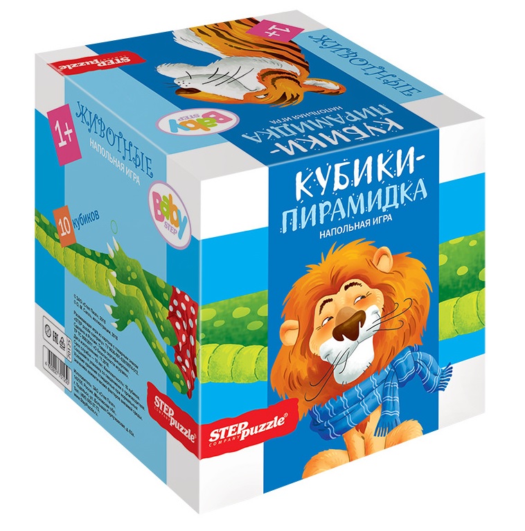 В наборе 10 кубиков. На их гранях изображены слон, лев, медведь и другие животные. А когда малыш соберет из кубиков пирамидку, он увидит большого зеленого крокодила. Все рисунки яркие и адаптированы для детского восприятия.